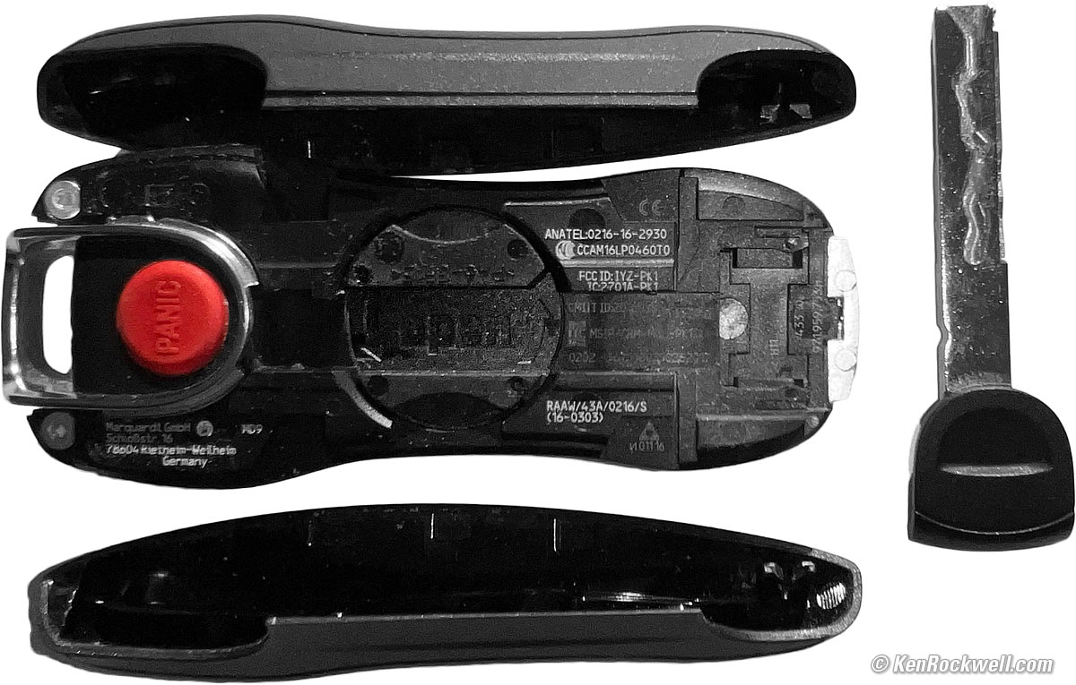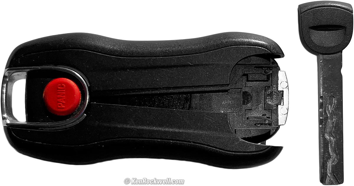 How to Change the Key Battery topTo change the battery, push out the metal emergency key with its molded plastic lip either with your thumb, or a rubberized blunt handle of a pair of pliers. Do not use a screwdriver because you'll mar the plastic! 1. Pull out the hard key. bigger.