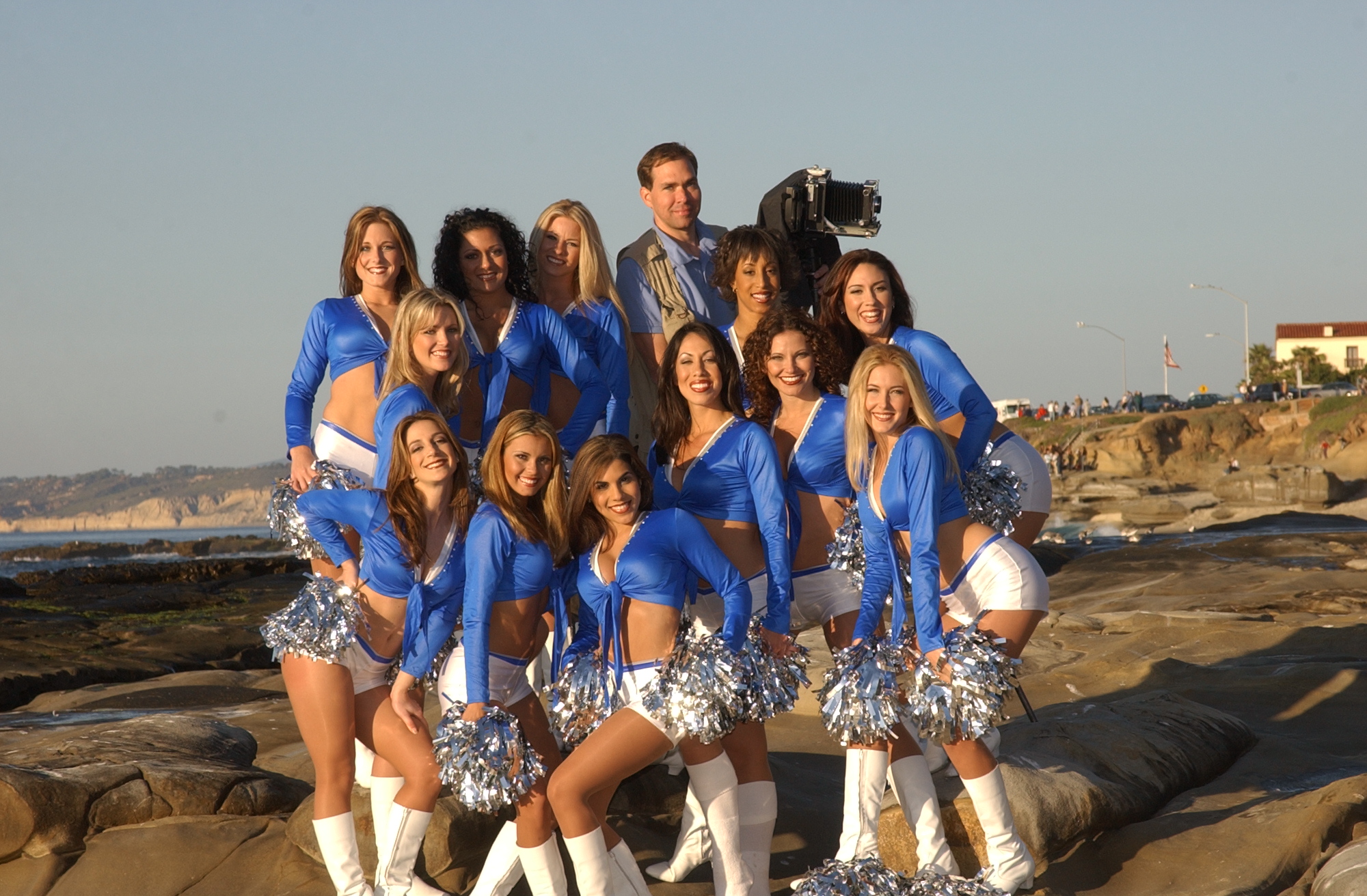 Here's the San Diego Riptide professional arena football team's cheerleaders I volunteered to photograph for their promo poster. I'm still bowled over laughing at the atypical "is it over yet?" smirk on my face. (That's me in the back with the big camera.) |