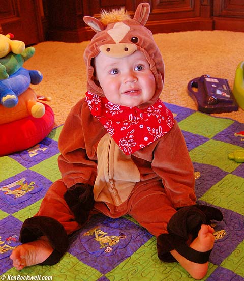 Mom tried on Ryan's Halloween costumes early. (Nikon D40, 18-55mm II kit lens, window light, Auto ISO chose ISO 1,600)