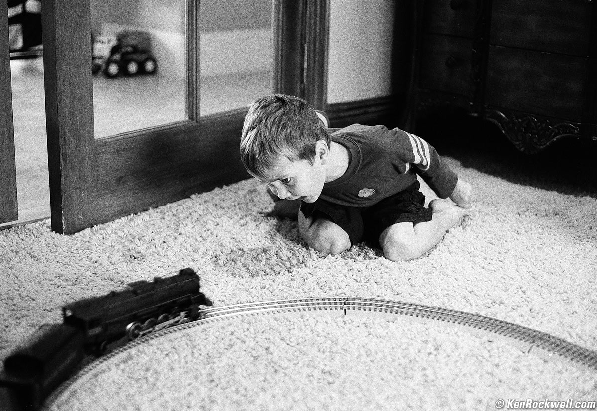 Ryan LOVES his Polar Express!!! bigger. (Canon EX AUTO, Canon EX 50mm f/1.8, 1/60 at f/1.8, Kodak TMax 400, lucky frame 39, NCPS process and scan.)
