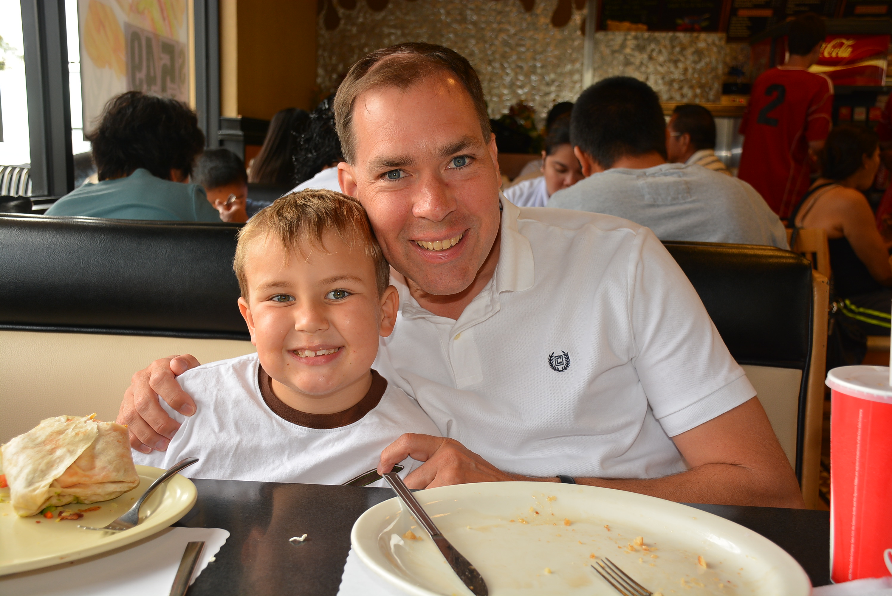 21 September 2013, Saturday Ryan's first ride of a bike without training wheels all by himself tonight! Ryan and Dada at Breakfast. (Nikon D7100 with SB-300 flash, Nikon 18-140mm VR DX at 26mm, Program and Auto ISO modes set f/4.5 at 1/125 at ISO 200, Standard Picture Control with +1 saturation and 7 sharpening, Athentech Perfectly Clear.) Camera-original © file.