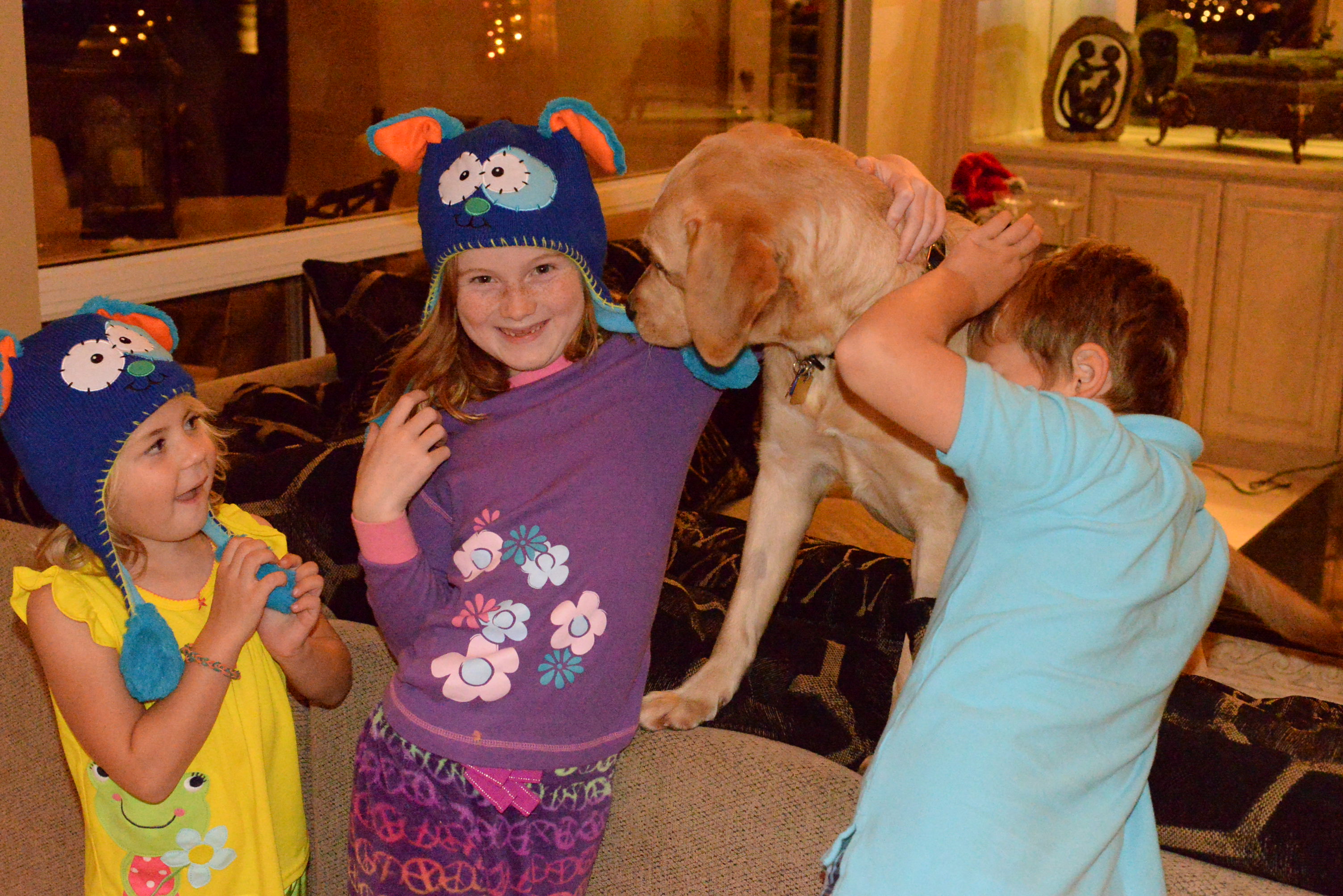 Ryan, Mama and Sasha. Note "Bruins" tag on Sasha. (Nikon D610 with built-in flash, Nikon 50mm f/1.4 G, f/5.6 at 1/125 at ISO 400, Athentech Perfectly Clear.)