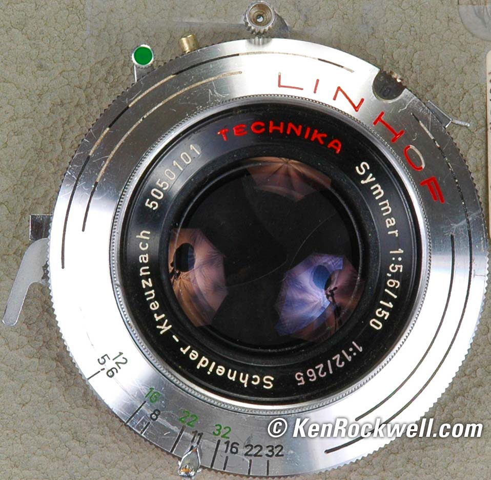 150mm f/5.6 Symmar Convertible Schneider 150mm f/5.6 Symmar Convertible, 49mm filters. Find used ones here. For bigger image click here. This is the sharpest lens I own, and it was made in 1955. I was going to throw it away when it came all beat up on my Technika camera I thought, since it was all beat up and a foolish "convertible" lens, that it couldn't possibly be any good. Keeping an open mind I tried it, and it is the sharpest lens I own. HA! This is why I keep advising to ignore everything you read and hear and just go photograph for yourself. For instance, Ansel Adams used a Cooke triple convertible for some of his most famous images according to an article by Gordon Hutchings in View Camera magazine, July/August 2004. Ansel used the 19" (480 mm) component for "Aspens, Northern New Mexico," 1958; both components to get 12" (300 mm) for "Clearing Winter Storm, Yosemite National Park," 1940; and the 23" (580 mm) component for "Moonrise, Hernandez, New Mexico," 1941. Enough said? I tape my shutter speed correction to the lensboard so I always have perfect exposures. It has a ten-bladed diaphragm. It goes past f/32 and stops at the equivalent of f/45. Use the black numbers; the green ones are for when you unscrew the front half of the lens and only use the rear cell. The rear cell alone gives you a 265 mm f/12 lens. Six elements, three groups. Remove the front cell to leave the rear three element two group section for a 265 mm f/12 conversion. |