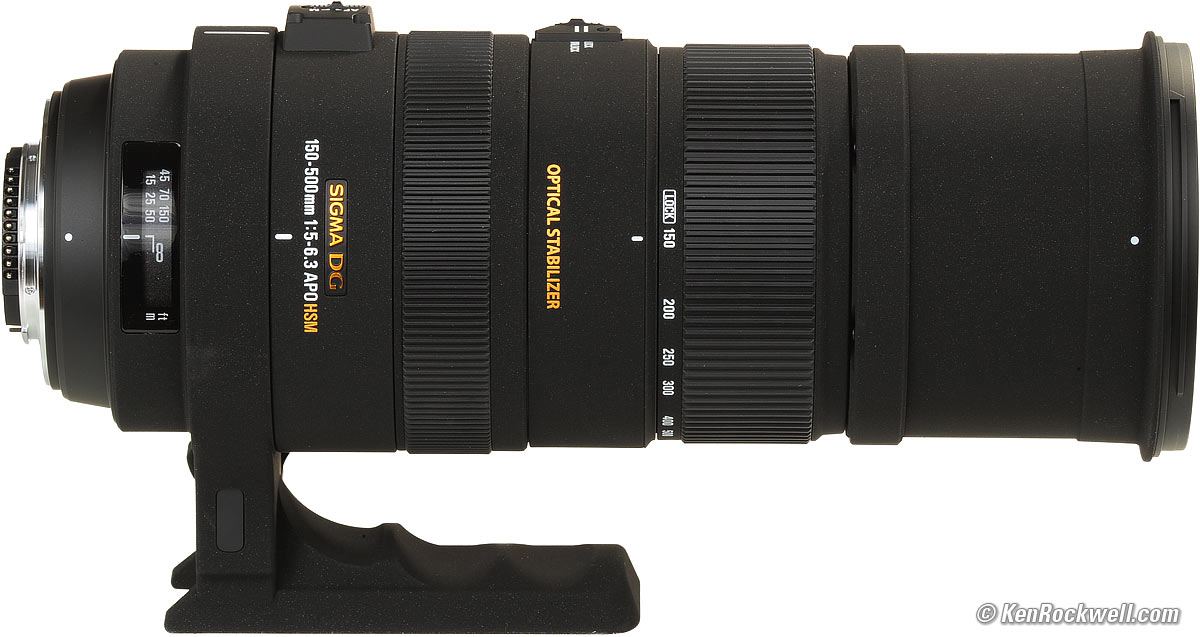 Home Donate New Search Gallery How-To Books Links Workshops About Contact Sigma 150-500mm f/5-6.3 Intro Specifications Performance Recommendations Sigma 150-500mm f/5-6.3 (86mm filters, 63.2 oz./1,792g as shown, 7.2'/2.2m close focus, about $1,000). enlarge. The biggest source of support for this free website is when you use these links, especially this link directly to this lens at eBay and at Amazon when you get anything, regardless of the county in which you live. It comes in mounts for Nikon, Canon, Pentax, Minolta Maxxum, Sony and Sigma cameras. Thank you! Ken.