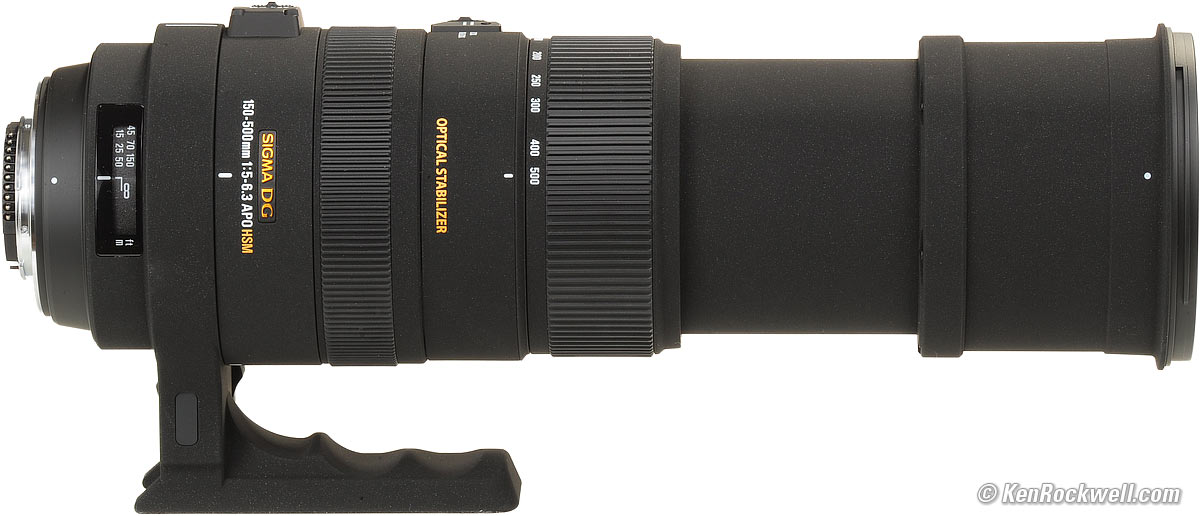 Name top Sigma calls this the Sigma 150-500mm F5-6.3 APO DG OS HSM. APO: Better optics. Doesn't really mean apochromatic. DG: Last-decade marketing fluff implying these work on digital cameras – duh. OS: Optical (Image) Stabilization. Same as Nikon's VR and Canon's IS. HSM: Hyper-Sonic Motor: quiet internal AF motor. Same as Nikon's SWM and Canon's USM.