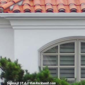 Sigma 30mm f/1.4 at f/1.4 This isn't a lens for shooting test charts. For that, get a macro lens. I'd use this 30mm f/1.4 in dim light, but put my usual lens back on in good light. The Sigma 30mm f/1.4 is soft in the corners, even stopped down, if you're looking for it. Shooting this lens the way it is intended I never saw this. This Sigma is softer than my Nikon 18-200mm VR when stopped down, especially in the corners. Don't use this lens for astronomy. Its optics aren't up to it, and there is no infinity focus stop. I'd use a Nikon 50mm f/1.4, especially manual focus, for astronomy. The best ultra-speed lens I've used at f/1.2 is the incredible Canon 85mm f/1.2L. The rest of these examples, in order to make the Sigma look competitive, were made manually focusing the Sigma lens for best results, while all the other lenses were left in autofocus. The other lenses focused properly on my D200 while the Sigma didn't. The Sigma worked fine on my D40. As a free feature, you can click any of the images to get to my review of that lens. f/1.4 Center Left Side