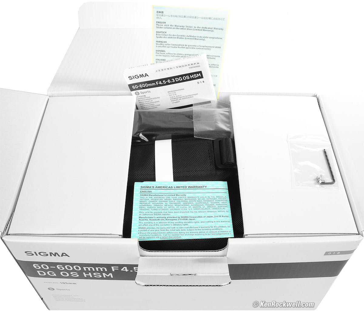 It comes in a big (14 x 9 x 5" or 36 x 23 x 13 cm) microcorrugated white box: Box, Sigma 60-600mm HSM Sports. bigger. Inside this box are two folded cardboard ends holding the lens, hood and caps in its case, as well as USA warranty paperwork, folded multi-language instruction sheet and an Allen wrench and spare screws for the tripod collar foot. There is also a 105mm snap-in front cap in the bottom of the box you might not notice.