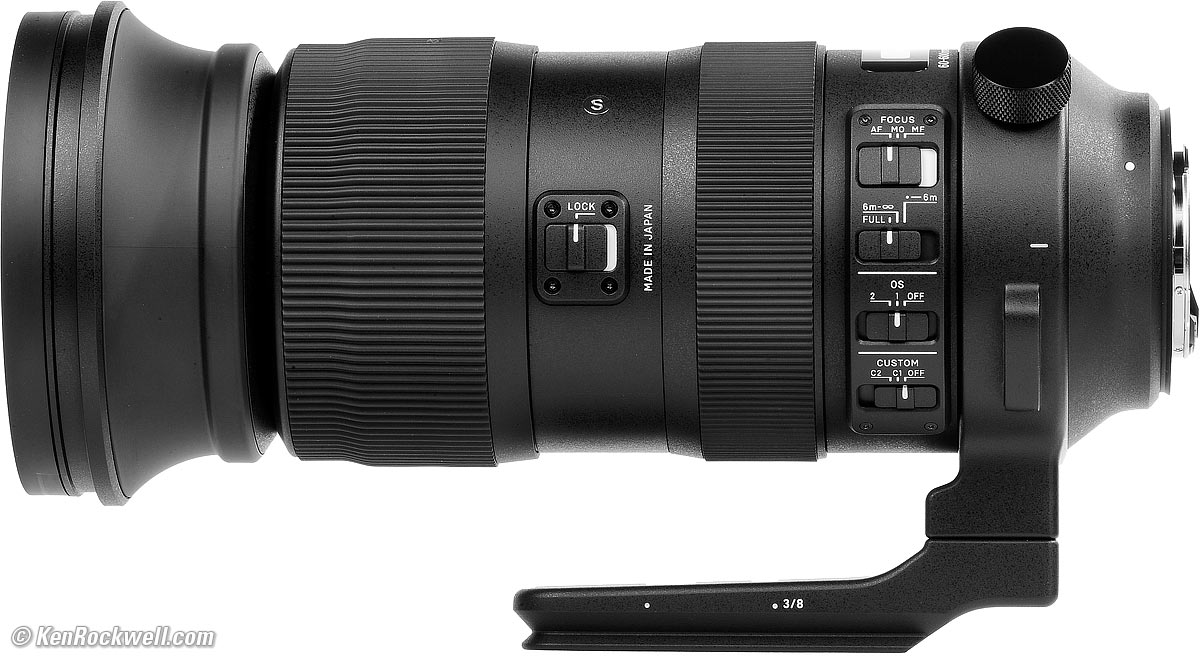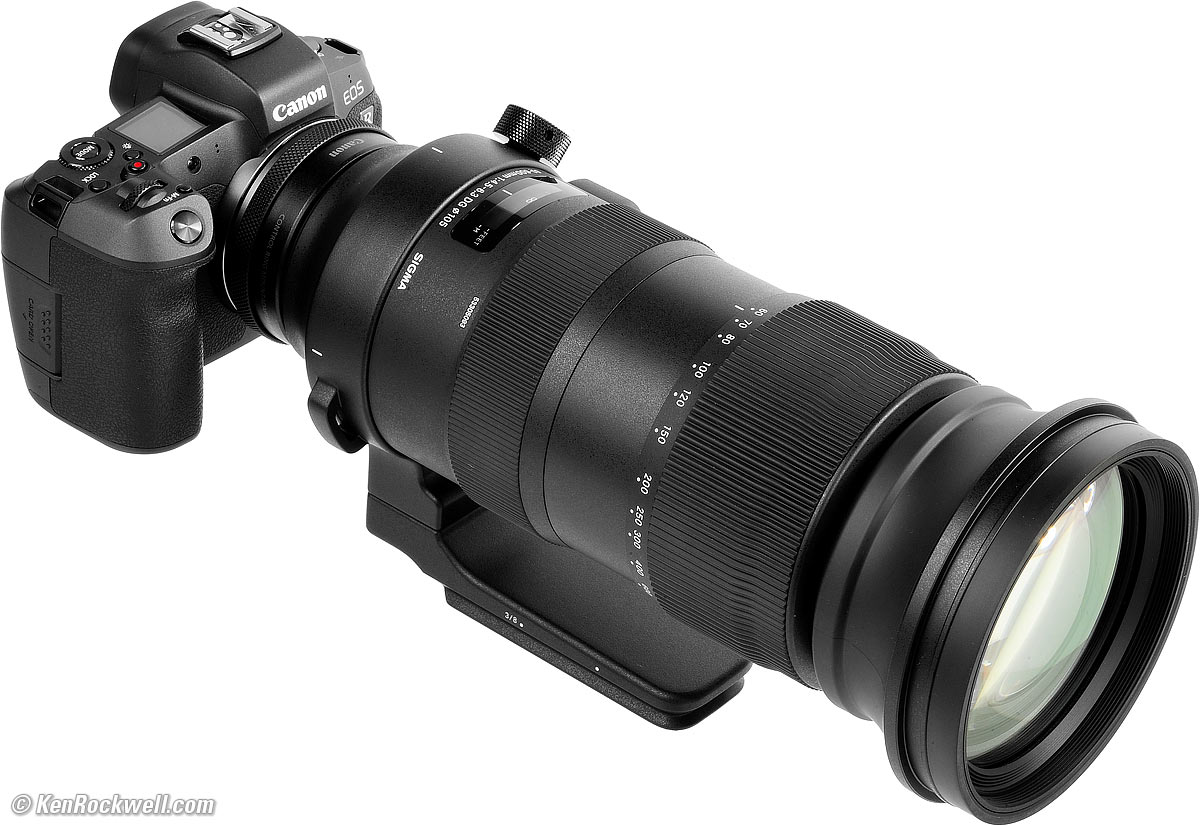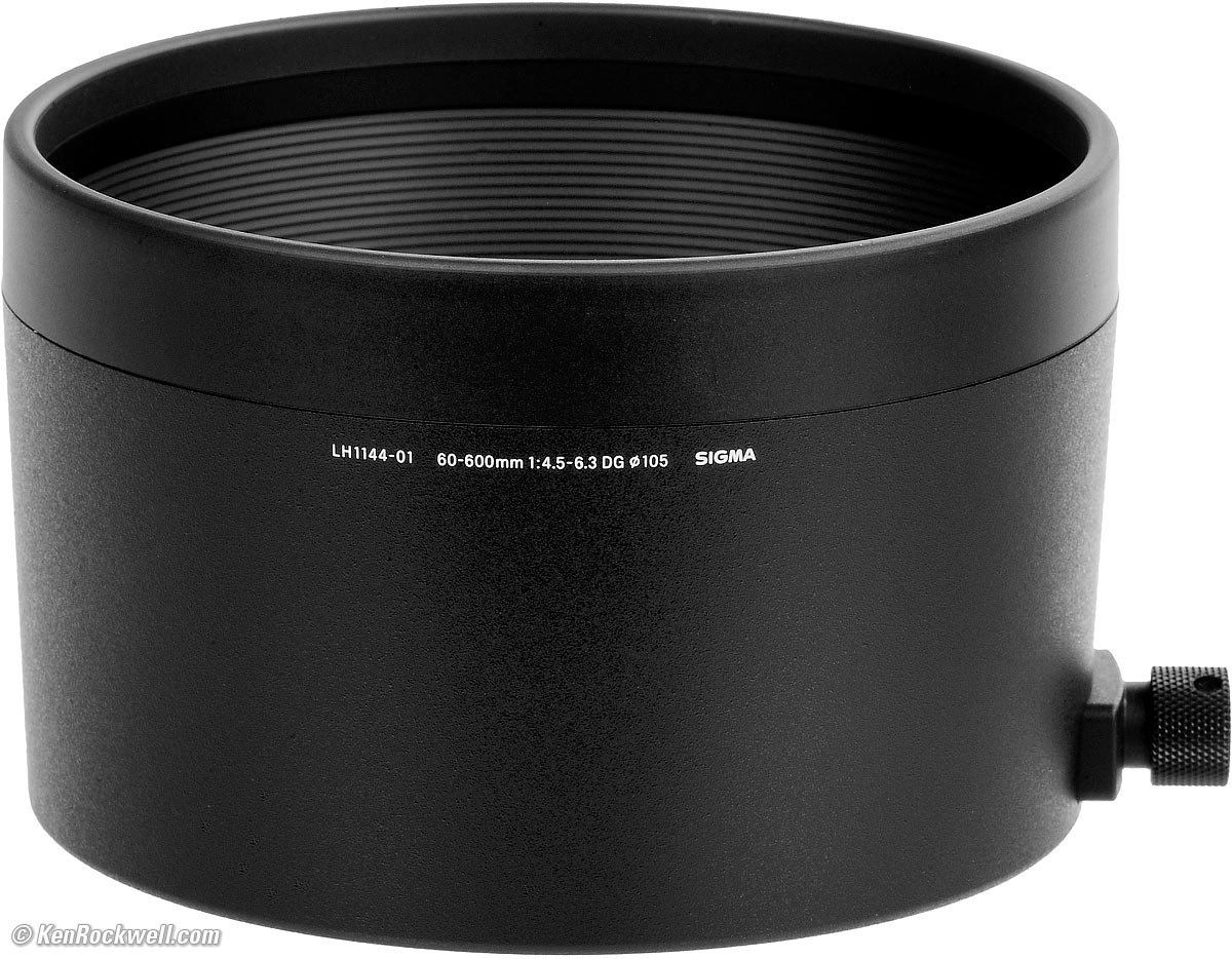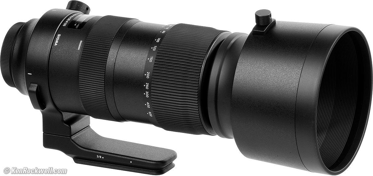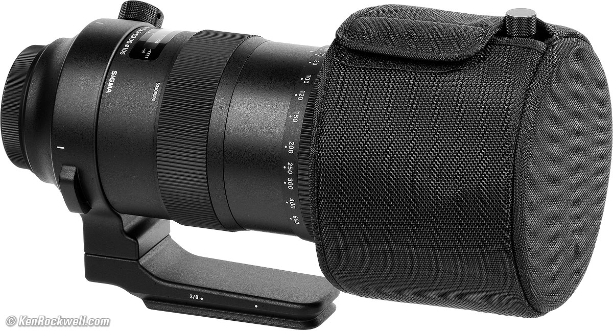 RecommendationsTop Sample Images Intro Format Compatibility Specifications Accessories Unboxing USA Version Performance Compared User's Guide Recommendations I got my Canon version at B&H. I'd also get any version at Adorama, at Amazon or at B&H, or get it used for about $1,500 if you know How to Win at eBay. This is a great lens. It is super-sharp at every setting and covers such a huge range and focuses so fast and so close that it can replace several lenses — if you don't mind the huge size, weight and price. You don't need a tripod unless you're using teleconverters. I easily hand-hold this beast with its excellent stabilizer at 600mm. This Sigma is as expensive as camera-brand lenses but offers a greater zoom range. Its zoom range is so broad that if you don't mind hauling it everywhere (I do), that it replaces both a 70-200 and a 200-600mm lens — so then it's not that expensive anymore. Its optics are wonderful; sharp and contrasty all the time. Most people make mistakes like shooting with not enough light, shooting at slower shutter speeds with subject motion, shooting above ISO 100 or at smaller than f/11 which lead to softer images regardless of your equipment. For best results I shoot this lens always wide-open at ISO 100 if at all possible for the sharpest results. I use a clear (UV) protective filter instead of a cap (exactly like an iPhone) so I'm always ready to shoot instantly. I only use a cap when I throw this in a bag with other gear without padding — which is never. The UV filter never gets in the way, and never gets lost, either. I'd use a 105mm Hoya EVO Antistatic UV or Sigma 105mm protector to protect this lens. Another excellent and less expensive option is the B+W 010 MRC UV, and the least expensive is the uncoated 105mm Tiffen Coarse Thread (1.0mm pitch) UV. All these filters use the coarse 1.0mm thread pitch; Tiffen makes so many filters that only they bother to mention the pitch. All these filters are just as sharp and take the same pictures, the difference is how much abuse they'll take and stay clean and stay in one piece. Since filters last a lifetime or more, there's no reason not to buy the best as it will last you for the next 40 years. Filters aren't throwaways like digital cameras which we replace every few years, like it or not. I'm still using filters I bought back in the 1970s! Be careful; a lens this long will be sensitive to poorly made filters. Check any filter your hope to use with this lens for flatness. Take photos with and without the filter, or even better, just hold it over the front of one side of a pair of binoculars or a small telescope. The image should be perfectly clear with or without the filter. If the filter is even slightly unflat, the image seen through the telescope will look awful! So long as it looks good when held in front of your scope, it will be perfect for pictures. This test instantly makes even slightly bad filters look absolutely awful, so if it looks OK through your scope, you're good. I got my Canon version at B&H. I'd also get any version at Adorama, at Amazon or at B&H, or get it used for about $1,500 if you know How to Win at eBay. This 100% all-content website's biggest source of support is when you use those or any of these links to approved sources when you get anything, regardless of the country in which you live. Sigma does not seal its boxes in any way, so never buy at retail or any other source not on my personally approved list since you'll have no way of knowing if you're missing accessories, getting a defective, damaged, returned, non-USA, store demo or used lens. I use the stores I do because they ship from secure remote warehouses where no one gets to touch your new camera before you do. Buy only from the approved sources I use myself for the best prices, service, return policies and selection. Thanks for helping me help you! Ken Rockwell.