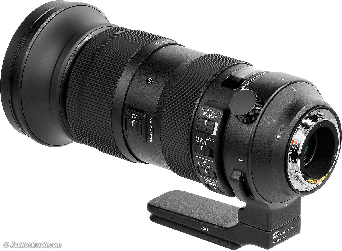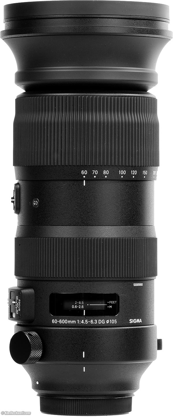 Sigma 60‑600mmFull-Frame f/4.5-6.3 DG DN OS HSM SportsFor Canon EF, for Nikon F, for Sony, für Leica L & for Sigma.Use an EF to RF adapter to use this on Canon Mirrorless. Use an FTZ or FTZ II adapter to use this on Nikon Z. Sample Images Intro Format Compatibility Specifications Accessories USA Version Sigma 60-600mm f/4.5-6.3 DG DN OS HSM Sports (Canon EF version, also comes for Nikon F, for Sony, für Leica L & for Sigma, uses 105mm filters, 95.5 oz./2,710g, 2-8.5'/0.6-2.6m close focus, $1,999) bigger. I got my Canon version at B&H. I'd also get any version at Adorama, at Amazon or at B&H, or get it used for about $1,500 if you know How to Win at eBay. This 100% all-content website's biggest source of support is when you use those or any of these links to my personally-approved sources when you get anything, regardless of the country in which you live. Sigma does not seal its boxes in any way, so never buy at retail or any other source not on my personally approved list since you'll have no way of knowing if you're missing accessories, getting a defective, damaged, returned, non-USA, store demo or used lens — especially with something this exotic. Get yours only from the trusted sources I've used personally for decades for the best prices, service, return policies and selection. Thanks for helping me help you! Ken.