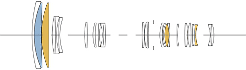 OpticsSigma 60-600mm internal optical construction. SLD and FLD elements. 25 elements in 19 groups. 1 SLD extra-low dispersion element, which helps reduce secondary axial chromatic aberration. 3 FLD extra-low dispersion elements, which help reduce secondary axial chromatic aberration. Dust and crud resistant front and rear coatings. Pumper zoom; the front pumps in and out as you zoom. No aspherical elements. No fluorite elements.