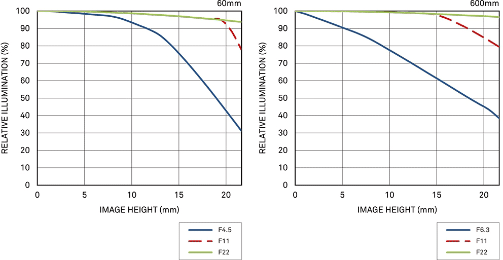 FalloffFalloff is invisible at all settings on full-frame, especially with correction turned on by default. It will be even less of an issue on APS-C. Amazingly, Canon cameras seem to recognize this lens and have correction data available. My Canon 5DS/R and EOS R with EF Adapter both do. If you go out of your way to turn correction off or are shooting on 35mm film, falloff is invisible at every setting except wide-open at 60mm and 600mm, where there is just a little bit that goes away as stopped down. I've greatly exaggerated the falloff by shooting a gray field and placing these on a gray background; it will not look this bad in actual photos of real things: