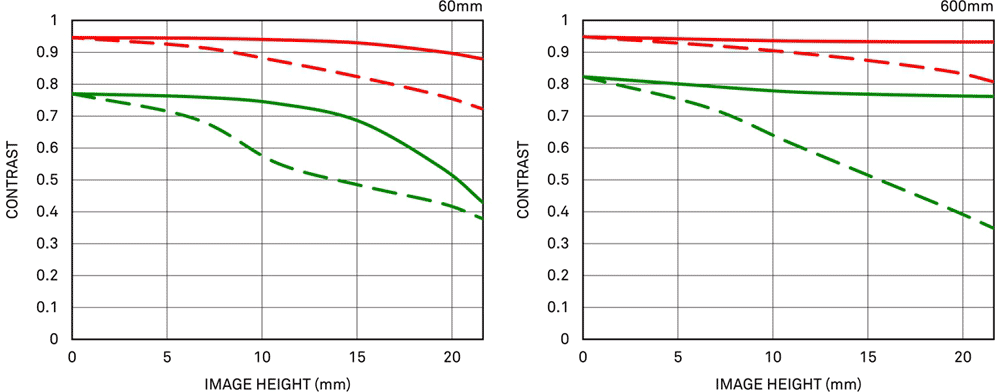 SharpnessThis is a very sharp lens, as good as Nikon's 200-500mm. The only limitation to picture sharpness will be your skill as a photographer. If you're not getting ultra-sharp pictures with this, be sure not to shoot at f/11 or smaller where all lenses are softer due to diffraction, always shoot at ISO 100 or lower because cameras become softer at ISO 200 and above, avoid shooting across long distances over land which can lead to atmospheric heat shimmer, be sure everything is in perfect focus, set your camera's sharpening as you want it (I set mine to the maximum) and be sure nothing is moving, either camera or subject. If you want to ensure a soft image with any lens, shoot at f/16 at ISO 1,600 at default sharpening in daylight through heat shimmer of rapidly moving subjects at differing distances in the same image. Even shot on my 50MP Canon 5DS/R it's super-sharp at all focal lengths at all apertures at all points in the full-frame image. It's just a tad softer in the corners at 600mm wide-open at f/6.3, but nothing I'd ever notice in actual shooting. Sigma's claimed MTF charts, calculated (not measured), unspecified apertures. These are purely computed; not actually measured. These are what Sigma calls "Diffraction MTF," which includes the calculated effects of diffraction. Sigma's "Geometric MTF" are fake, cheerfully excluding the very real softening effects of diffraction.