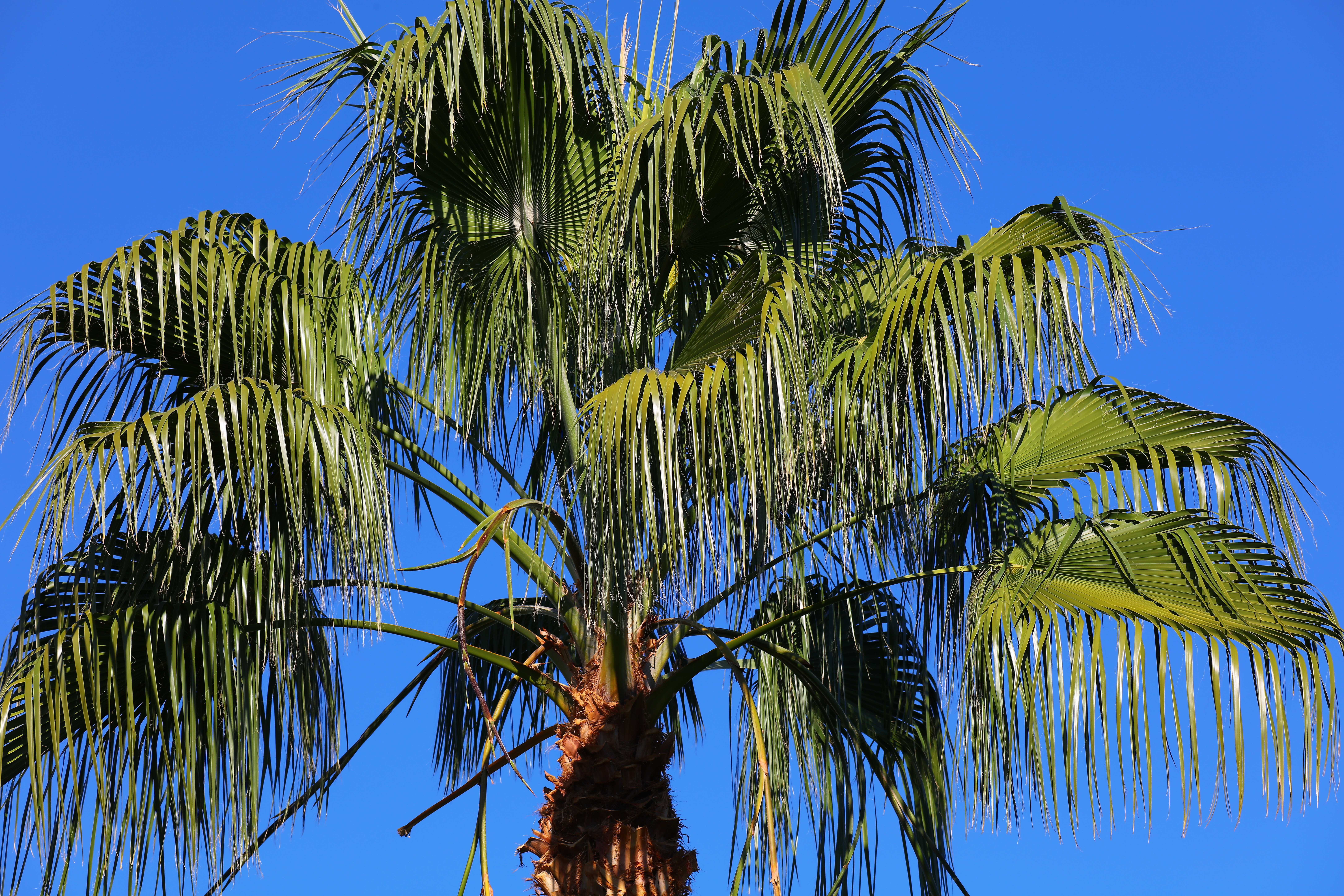 Palm at 186mm, 12 November 2018. Canon 5DS/R, Sigma 60-600mm set to 186mm, f/8 hand-held at 1/400 at Auto ISO 100, Perfectly Clear. bigger, full-resolution or camera-original © file. This is a real 3-D tree, so only the front fronds are actually in focus.