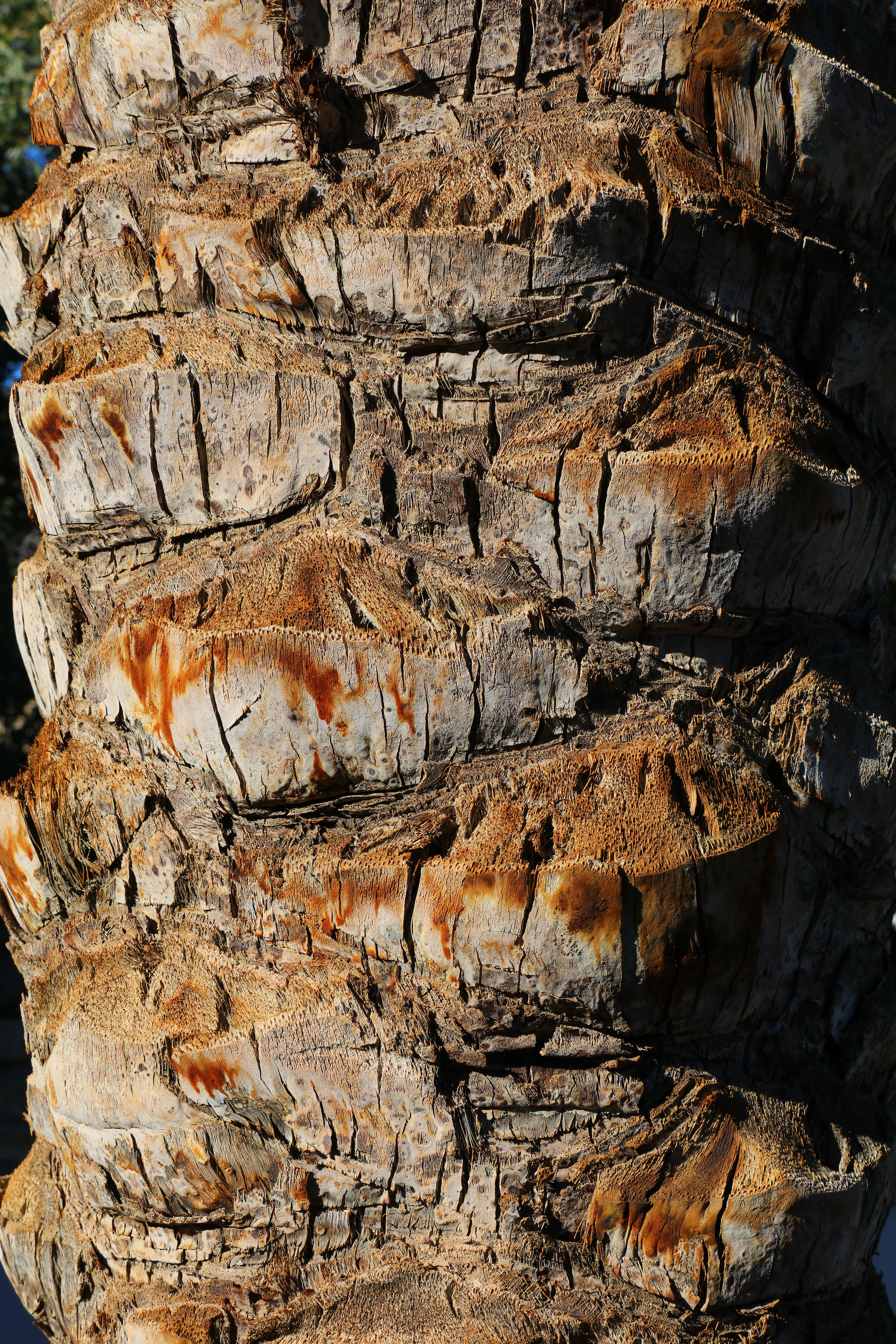 Palm trunk 65mm, 12 November 2018. Canon 5DS/R, Sigma 60-600mm set to 65mm, f/16 hand-held at 1/100 at Auto ISO 100, Perfectly Clear. bigger or camera-original © file. This is a real 3-D tree trunk, so only the center is in focus while the sides are farther away and not in focus.
