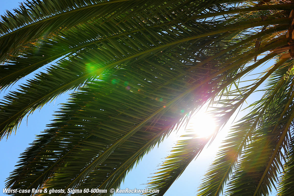 Flare & GhostsThis 60-600 has a very complex 25-element optical system and thus will have some flare and ghosts if you out of your way to point it at the sun as I did here. Even if you do, this is as bad as it gets, a few green blobs: Worst-case flare and ghosts. bigger.