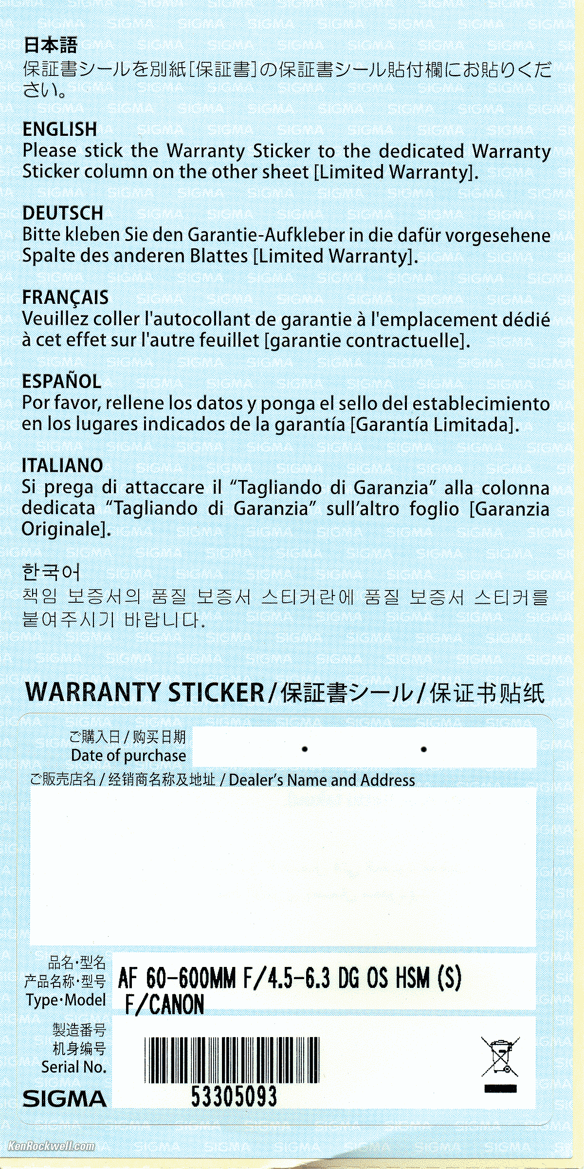 Box, Sigma 60-600mm HSM Sports. bigger. The box and lens are completely unsealed. There is no way to know if anyone else has been fiddling with your lens, swapping parts and accessories, or even if it's a used lens. That's why it's critical only to buy from an approved online source, since they ship from automated warehouses where no shifty salesmen or customers ever get to touch your exotic new lens before it ships. While new $5 CDs, DVDs, Blu-Rays and bottles of milk and drinking water are sealed and quite obvious if anyone's opened them, paradoxically Sigma doesn't bother sealing anything on this $2,000 lens, so your only insurance is to buy only from a trusted online dealer.