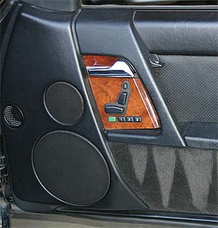 1990 - 1995 The first version was sold as model years 1990 through 1995. It had the highest price of any of the versions, even in 1990 dollars. OK, it probably is the most expensive car ever that's also practical enough to drive every day for hundreds of thousands of miles. It had some crazy features that went away in 1996, like remote control and memory of the inside rear view mirror and automatic locking of the door map pockets. The steering wheel automatically moved out of the way when you opened the door. Spotters Guide: You can identify this version from across the street by the three rectangular slotted vents in each front fender. As the signature ride of the WASP elite you can see a 1993 SL500 featured in the movie "Another Stakeout." That's it flying past an explosion on the cover, which is why I had to get this DVD out of curiosity. A gorgeous new red 1993 is loaned to undercover cops to help them blend into a nice area. The SL does the usual on-screen burnouts with overdone engine foley and drives through buildings. It's even used as a four-seater: a big girl and her dog get to ride in the back with the trunk held open from too much luggage on a trip. (Bad idea if the rollbar deploys!) Like all these movies the cop's boss told them not to damage the loaned car and I won't tell you what happens. It's a funny movie even without the SL500. (click to get DVD) In 1994, another SL500 was used in "Ace Ventura: Pet Detective" as a visual clue that its driver was a star with unlimited cash to blow on toys. It's seen about 35 minutes into the DVD. (click to get DVD) Unfortunately the first SL500s had ordinary hydraulic 4 speed automatic transmisson that were slow to kick down, if at all. It was great from a standing stop and on paper, but dull to drive since you miss most of the power from a lack of kick-down if you're already moving. Even when it did kick down it wouldn't always kick all the way down to redline. Ratios were 3.87, 2.25, 1.44 and 1.00 with a 2.65 rear for shift points of 44, 76, 119 MPH and 2,170 RPM at 60 MPH. You can identify this transmission by the "P R N D 3 2 " indication on the transmission selector. The newer 5 speed says "P R N D 4 3 2 1" The engine is the same M119 DOHC 32 valve VVT plant with a teeny bit less torque (332 vs. 345 foot-pounds) and a teeny bit more horsepower (322 vs. 315 HP) than the 1996 - 1998 models, however the dull transmission makes this much duller to drive than anything newer. These model years are also an inch shorter; the front bumper is flush with the grille. The other way to recognize these models is that they have three rectangular vent holes at the rear of each front fender and the odometers are traditional mechanical reels. In about 1995 the odometer was updated to a backlit LCD and the speedometer is electronic, meaning they all read correctly while driving in reverse, too. The very first models didn't have the excellent Bose Hi-Fi system. By about 1994 all models have come with the same excellent Bose stereo system, standard, even if the radio head was changed in different years. There are two round speaker holes, woofer and tweeter, in each door panel in the versions with the Bose system.