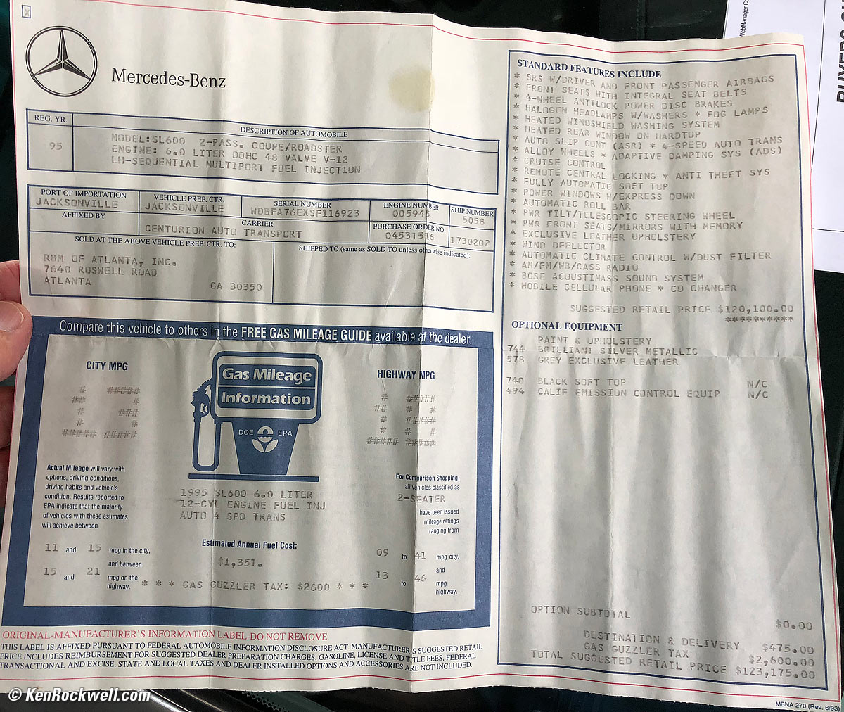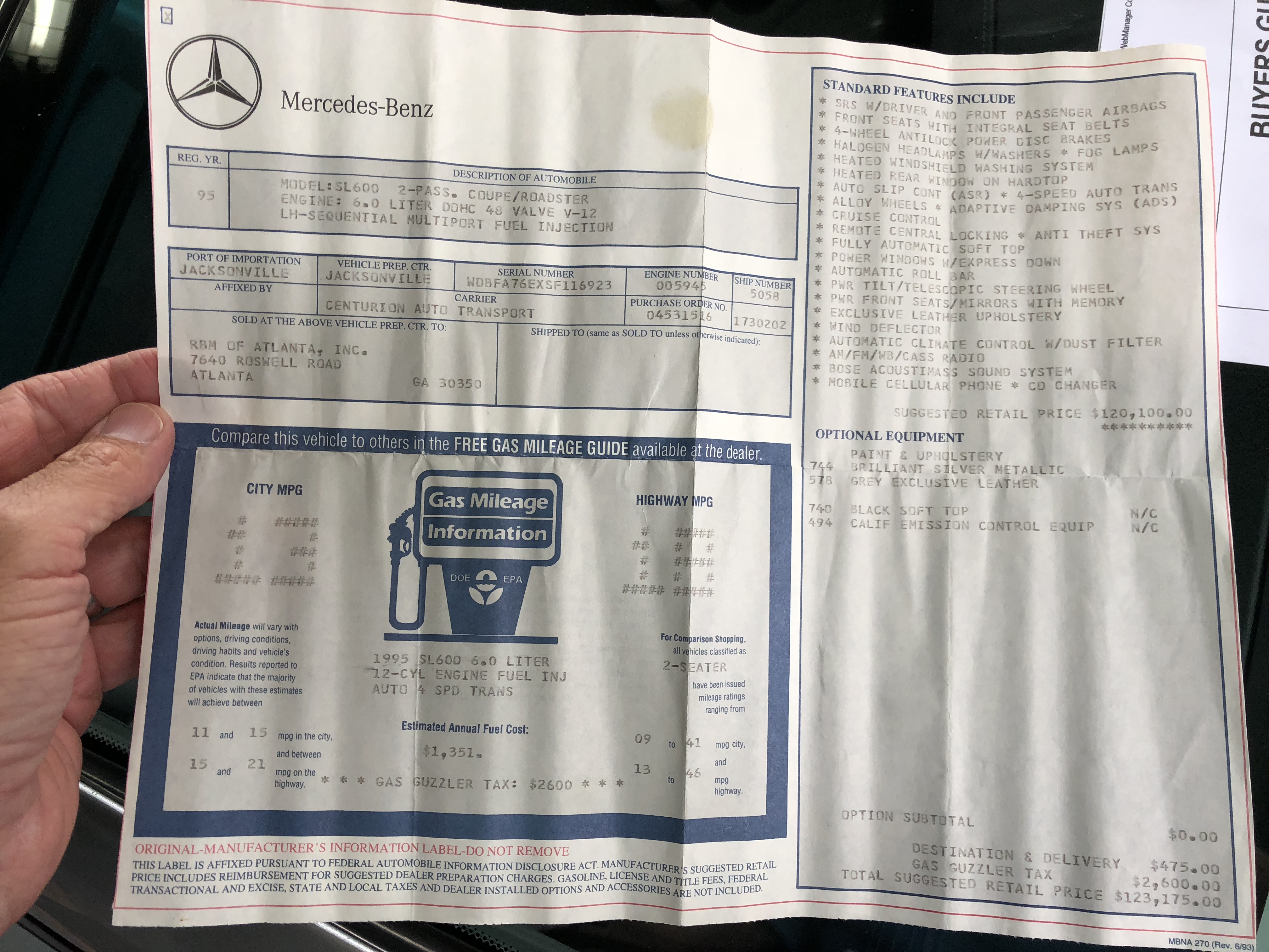 Window sticker of a 1995 SL600. bigger or camera-orinal © file.