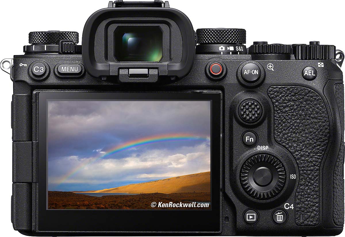 Sony A7R Mark V multi-flip "4 axis" screen. click any to enlarge. 3.2" diagonal flipping touch screen. 4:3 aspect ratio, so 3:2 images will have black borders along top and bottom while 4:3 images can fill the screen. 2.1 MDots. Manual brightness control with Sony's usual "Direct Sunlight" mode.