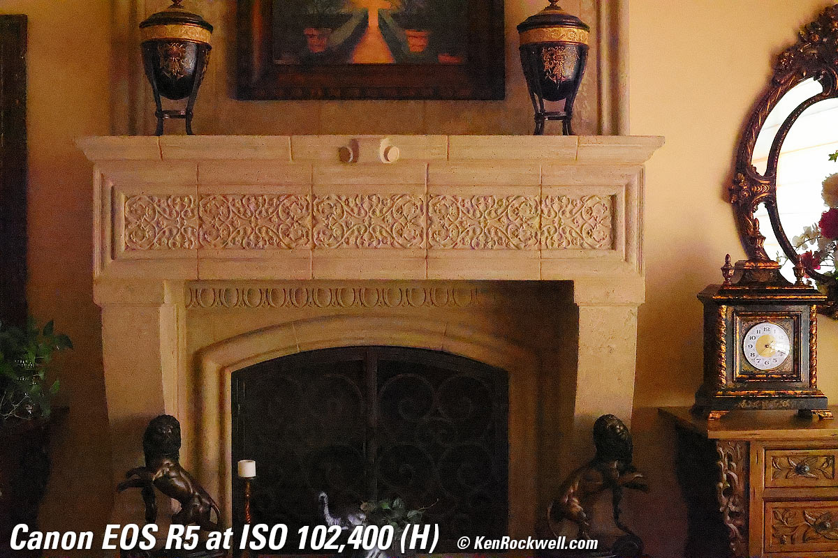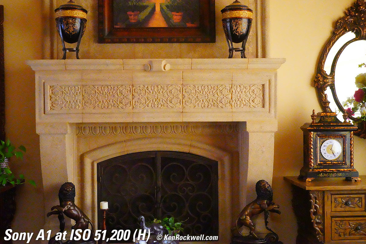 Dark-Area 600 × 450 Pixel Crops (14.4× magnification) High ISOs details dark detail performance topHere are different crops from the same images as above, now showing the dark grillwork of the fireplace. Note how the most detail in the fine screen is at ISO 50 (L), which looks quite remarkable and almost three-dimensional. Bravo! These details are successively smudged-away more and more by the noise reduction at the ISO increases. This is normal for all digital cameras. The bricks behind the grill go away by ISO 25,600, and at ISO 102,400 (H) you can barely see the big iron bars! This is magnificent performance, and typical today. It's better than my Canon EOS R5. (Follow those links and you can compare the original files for yourself.) The Canon EOS R5 has less detail in the shadows at high ISOs than the A1. The A1 is superior in the shadows while the R5 is superior overall and for detail. See? There is no such thing as universally better or worse; it all depends on what's important to your own work. Shadows are the least important part of most images. That's why they're called shadows: our eyes can't see as much in them to notice differences; our eyes don't see or to pay much attention to detail in shadows. Click any for the camera-original © 50MP FINE JPG files (about 20 MB each): Click any for the camera-original © JPG files (50 MP, about 20 MB each).