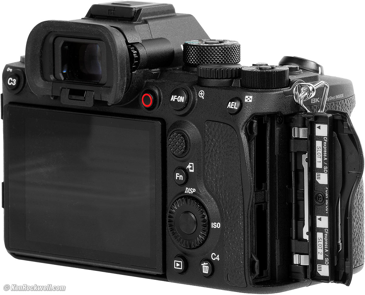 Cards & FormattingThere are two slots. Each takes your choice of either regular SD cards as I prefer, or expensive CFexpress Type A cards. The more common CFexpress Type B cards will not fit. Card format is at MENU > Shooting > 2 Media > Format. I prefer my A1 to make a new folder each day, which Sony calls Date Form. I set this at MENU > Shooting > 3 File > File/Folder Settings > Folder Name > Date Form. The card door requires two separate motions (down and then out) to open, which some might prefer, but the strap ring often interferes with flipping it open. Be sure to pull-up the strap lug before you try to open the door: Sony A1. bigger.