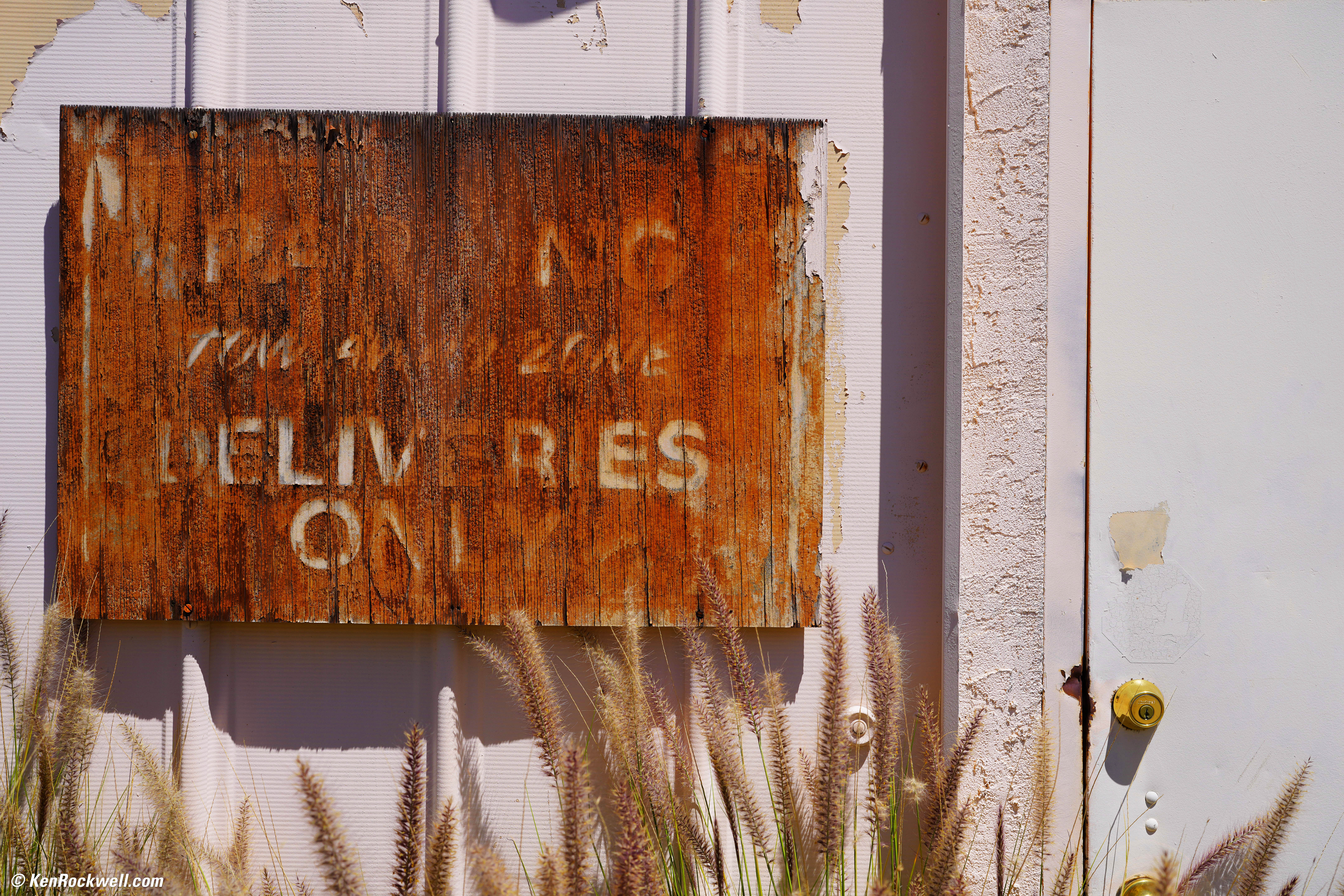 Deliveries Only, 11:41 AM, 29 April 2021. Sony A1, VV Creative Look with +9 Saturation, Sony FE 35mm f/1.4 GM at f/8 at 1/500 at Auto ISO 100 (LV 15.0), Perfectly Clear. bigger or full-resolution. While it's so sharp you can see every pore in the wood and each paint molecule in the wall, of course the brushy plant in front of the wall is closer and out of focus.