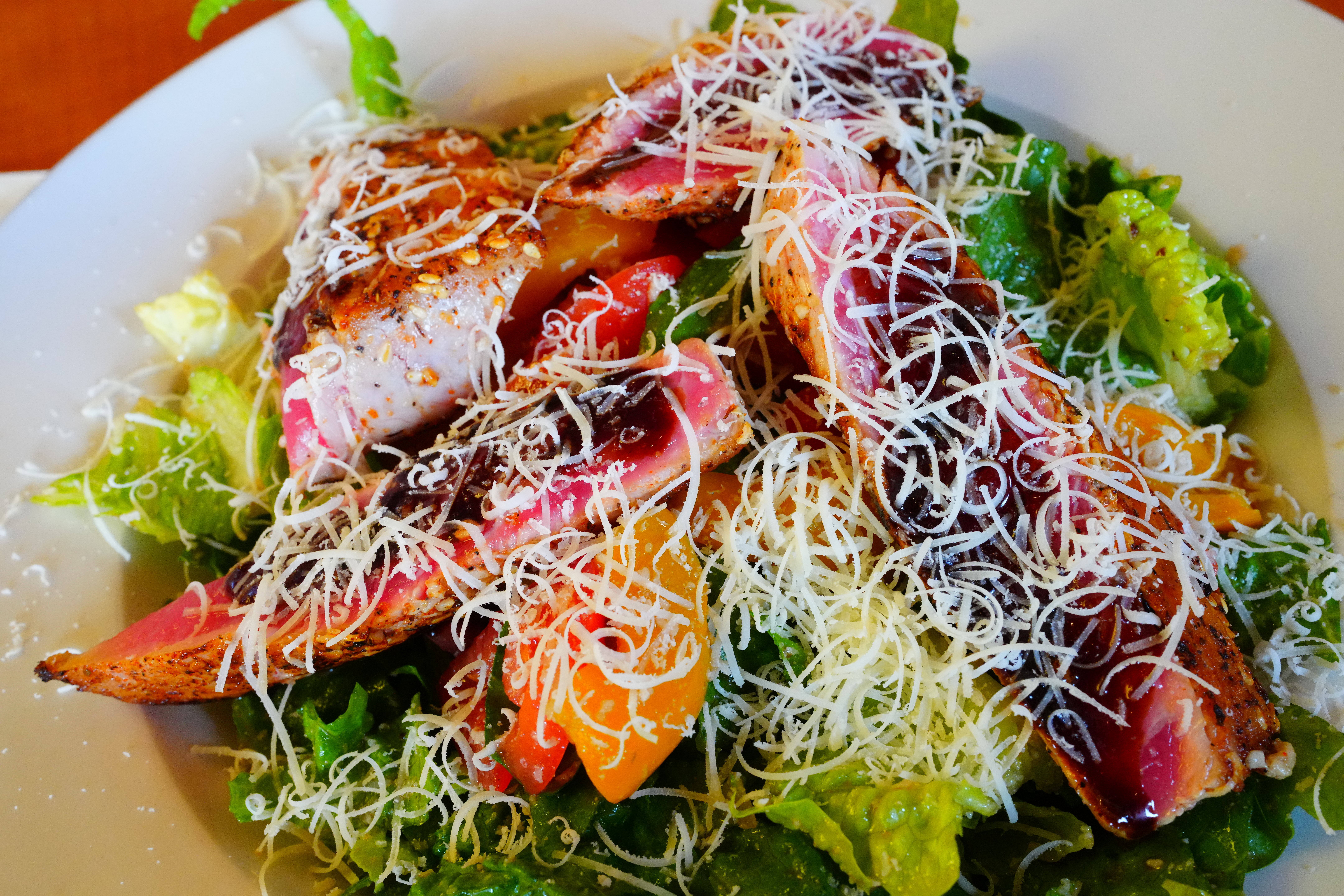 Seared Ahi Salad with Freshly Shaved Parmesan, 2:25 PM, 01 May 2021. Slight crop from Sony A1, VV Creative Look with +9 Saturation, Sony FE 35mm f/1.4 GM at f/11 at 1/40 hand-held with stabilization at Auto ISO 4,000 (LV 6.9), Perfectly Clear. bigger or camera-original © LIGHT JPG file. It's super sharp and vivid, even at ISO 4,000 here. Of course this close very little is in focus because of limited depth-of-field. My lunch looks fresh and delicious. Mangia bene!
