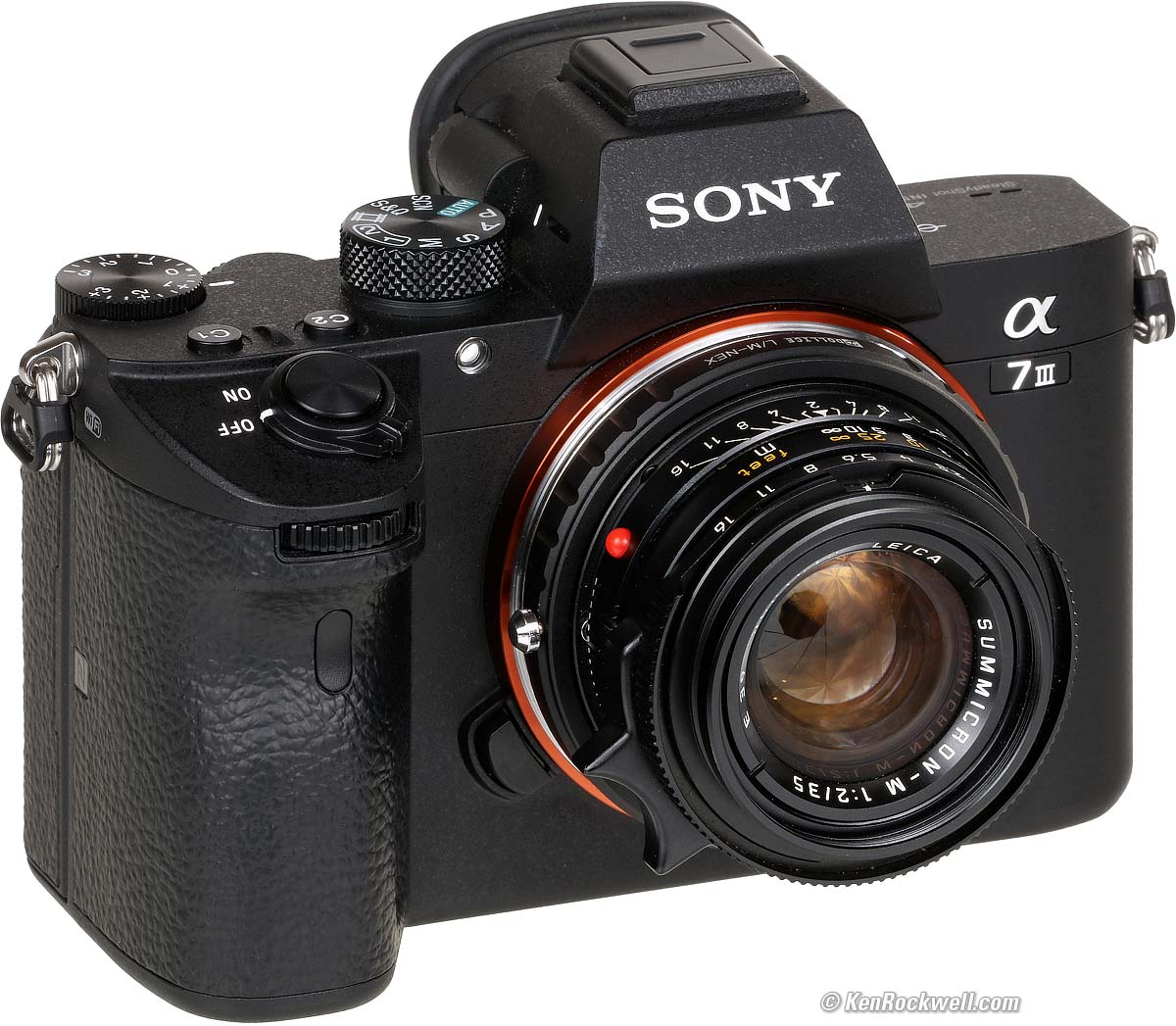 Other Brand AdaptersSony A7 III and LEICA SUMMICRON-M 35mm f/2 on adapter. bigger. While you can adapt any lens of any brand or age to the A7 III, they won't work as well as native Sony or Zeiss FE lenses, or Alpha or MAXXUM lenses with the LA-EA4 adapter. Lenses that perform magnificently on their own brand of camera may or may not autofocus that well adapted to Sony. If you demand the best performance, just use the same brand of lens as your camera. Adapters should never be your go-to for the best performance. Don't expect the best results for sharpness or for autofocus from other-brand adapters if you're picky. Adapters are great for fun; you can get adapters cheap for any kind of lens, but not only may autofocus be iffy, adapted wide-angle lenses usually aren't very sharp on the sides at large apertures because Sony's full-frame mirrorless sensors are optimized for lenses with a curved fields. Most other adapted lenses won't seem very sharp on the sides at large apertures due their flat fields not interfacing well with the curved fields needed by Sony's sensors on these cameras. If you get the center in focus, the sides will probably be off, and if you get the sides in focus, the center will be off. This is more of a problem with wider lenses and at large apertures; stop a lens down and the sides will come into better focus. See also my Meta Bones Adapter Review, which is the best I've found for using Canon lenses — but if you deserve the best, you're going to wind up buying Sony's G and GM lenses eventually.