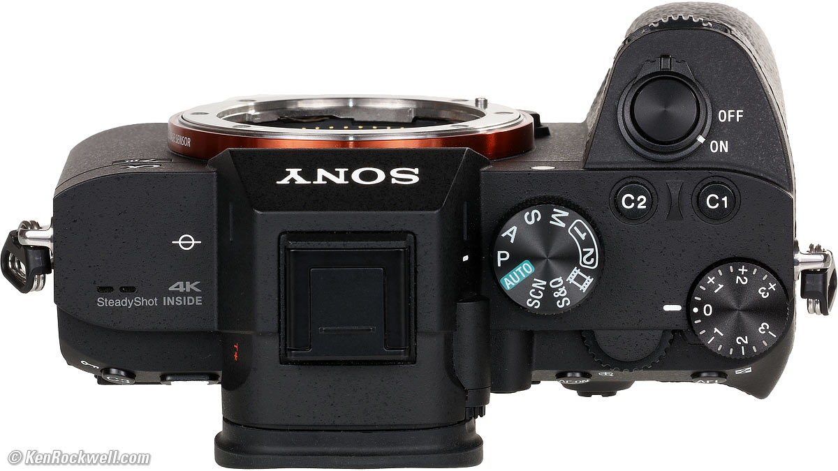 ErgonomicsErgonomics are identical to Sony's other top two cameras, the A9 and A7R Mk III. This A7 III uses the same body and firmware. ● The A7 III has so many programmable buttons that it's easy to get it set up the way we'd like. ● The M1 and M2 camera-setting-recall potions on the top dial are lifesavers for instantly resetting my A7 III for different conditions. See Usage for how I set mine, M1 for photos of places and things and M2 for photos of people. Oddly recalling either of these can lock-up the camera for a second or two; if this is a bother it can be faster to turn the camera off, move the top dial and turn it back on, which bypasses the screen showing you all the settings in each of these. ● A and S exposure modes recall whatever they were set to if you turn the camera off and back on again. In other words, I use the A mode when I want smaller apertures in low light, and any time I go into A mode it comes back up at the same aperture at which I left it the last time I used it, like f/11. Ditto for the S mode; regardless of what I do in the other exposure modes, the S mode comes back up where I left it the last time, like 1/500. The battery goes in backwards from what you'd expect: instead of the curved side facing the curved outside of the grip into which it slides, the square side of the battery faces the outward curved part of the grip and the battery's curved side faces inwards towards the sensor. The battery door catch oddly isn't spring-loaded. You have to consciously slide the lock home to be sure the door stays shut; you can't just snap the plastic battery door shut. Memory cards go in with the label away from you. Oddly card 1 is on the bottom and card 2 is on the top; which you'll need to know when you set what records to which. Unlike Nikon and Canon pro DSLRs whose physical design has been refined over many decades and whose cameras feel soft and comfortable due to their expertly designed curves, the A7 III feels blocky because it is. The A7 III is mostly straight lines and hard edges, and feels that way. Sony's industrial design for these cameras is still in its infancy. ● Turn-on can take a second or two if the camera's been off for a while; it's not always instantaneous as the A9. ● Like its siblings, Sony's menu structure is still in need of organization. Even experts usually have to look through every menu to find any given item since related items are only sometimes filed together in meaningful tabs. Often items are found in random places, for instance, FORMAT is hidden at MENU > Suitcase > page 5 out of 7 > Format.