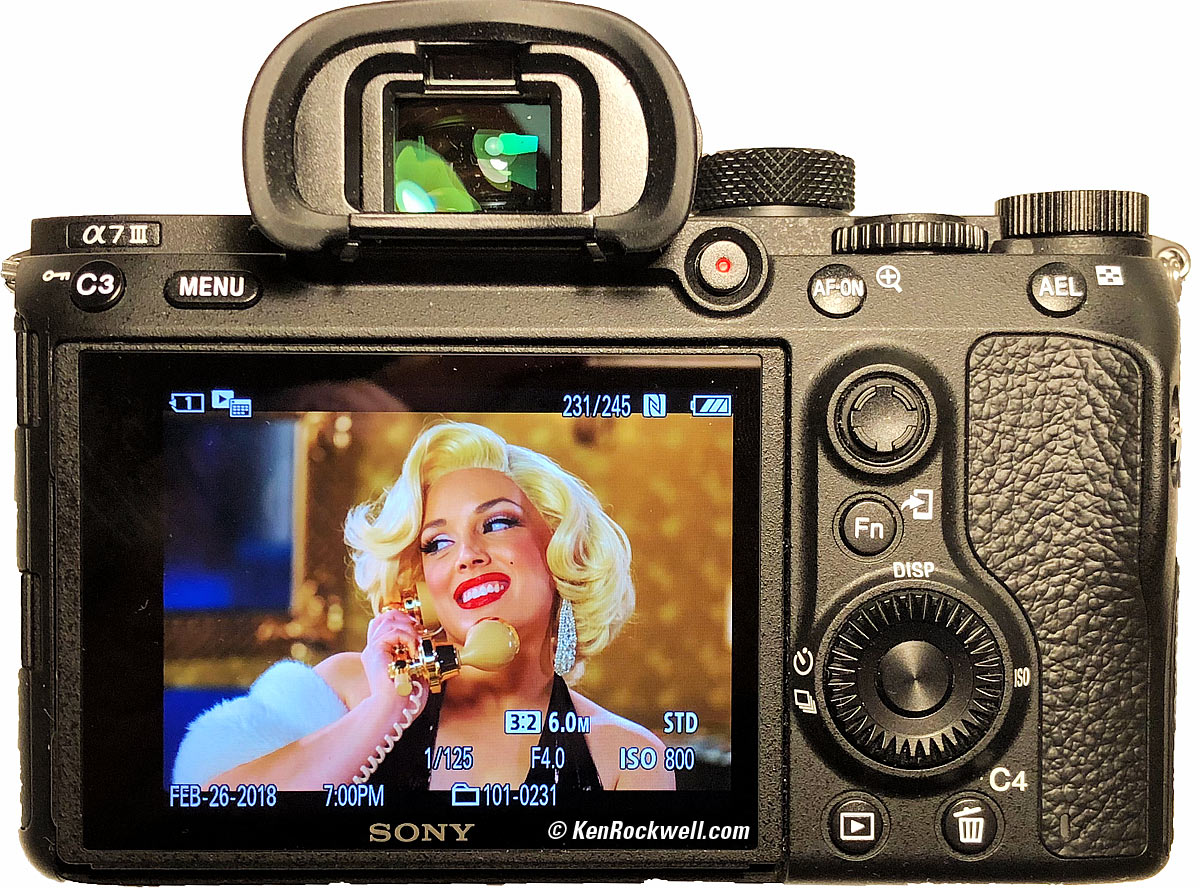 It autorotates as you turn the camera, just like an iPhone, if you set MENU > PLAY > page 3/3 > Display Rotation > Auto. Oddly as in earlier Sonys, even though it's smart enough to rotate the image as you rotate the camera during playback, if you zoom the image, it won't autorotate. There's no way to read the file number. Just like the A7R III and Sony A9, this A7 III has a new thumb-nubbin which works for zoomed scrolling in all 8 directions.