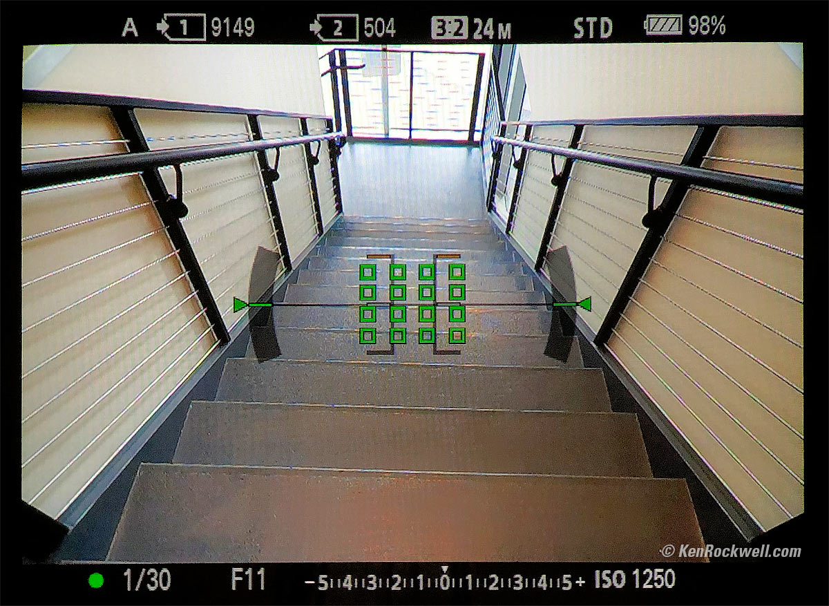 Autofocus● Autofocus is great. It's fast, sure and usually totally automatic. ● With face recognition the A7 III autofocuses throughout the entire frame, not just the central area, but you do have to enable Face Detection before it works. Facial Recognition: Actual view through the Sony A7 III's electronic viewfinder. bigger. See the little green box over the girl's face? The A7 III finds any and all faces, locks-on and tracks them wherever they are in the finder, not just the center like a full-frame DSLR. It's important to use a top G or GM lens whose internal AF system is optimized for the Sony mirrorless system; if you use an older or adapted lens, you'll miss much of what the A7 III can do. ● While Sony claims only "93% coverage" for the phase-detection pixels, for people photos face recognition covers the entire frame, and as far as I'm concerned, 93% is the whole frame for phase detection I never focus on the edges, but I do need to focus on the top and bottom and sides which my full-frame DSLRs don't let me do. Phase Detection: Actual view through the Sony A7 III's electronic viewfinder. bigger. In this image the A7 III has only selected some of the central phase-detection AF points; it can select them anyplace in the image and it's truly satisfying to see them chase a fast-moving subject all over. Set the A7 III to AF-C for continuous AF to let the system shine. Turn on Face Detection (MENU > Camera 1 > page 6/14 > Set Face Prty in AF > ON), and the A7 III finds the closest eye and just focuses on it all by itself, with no need to select autofocus areas manually: With general subjects, zillion little green boxes magically fly all over your subject and the camera just focuses on it. Set the DMF focus mode with the Fn button to allow manual focus override during AF-S (single) autofocus. It's so smart that it will magically zoom into faces as you turn the focus ring!