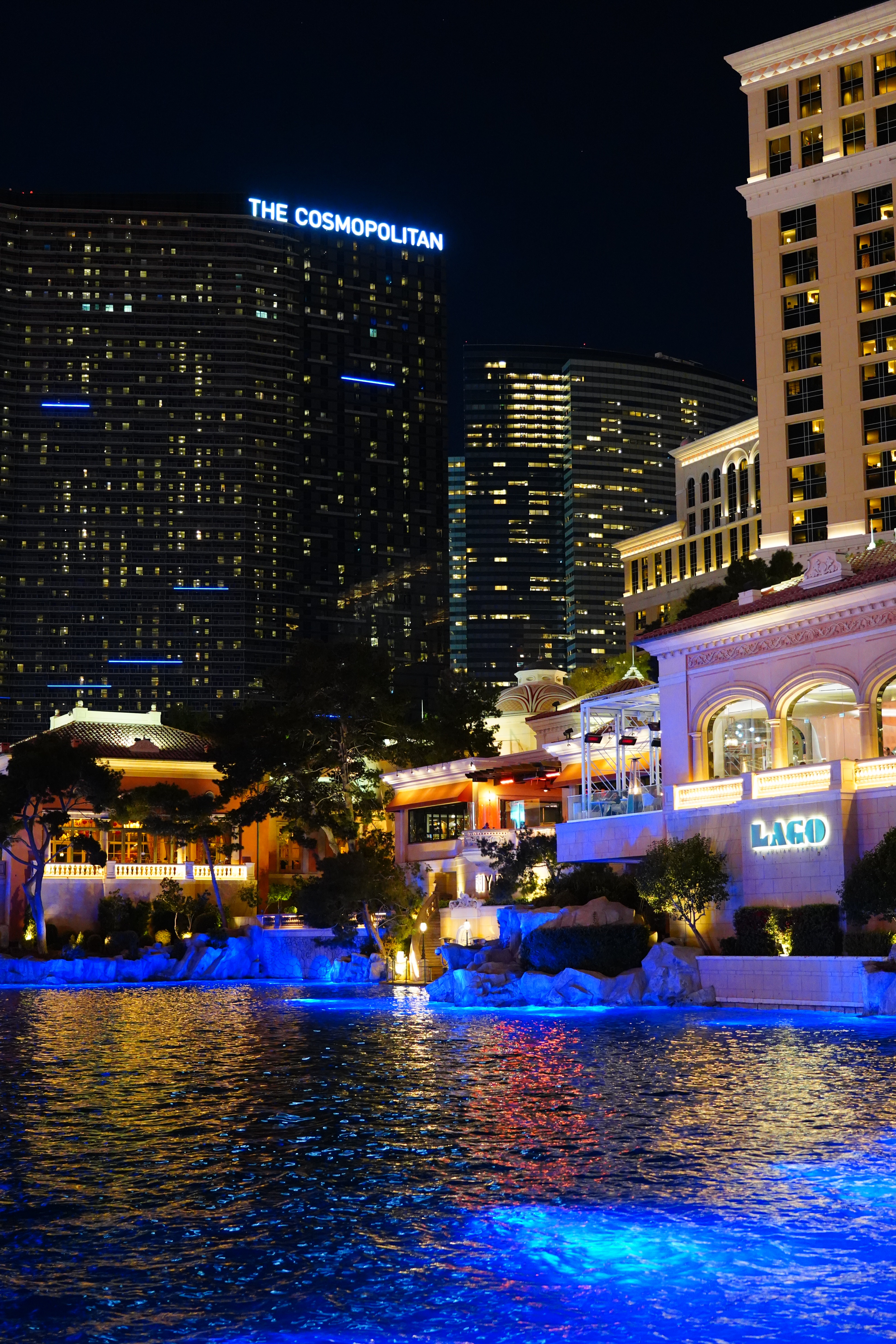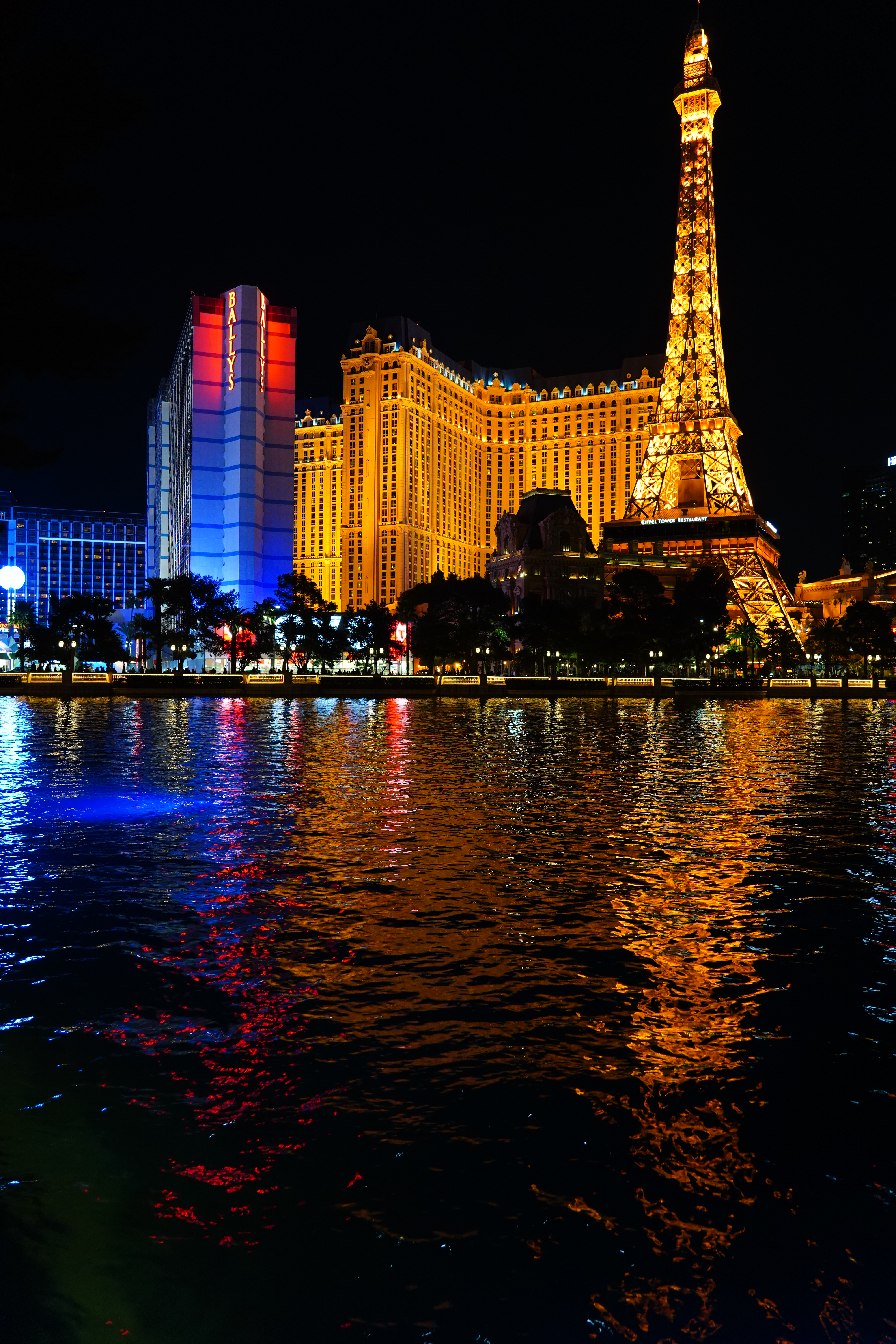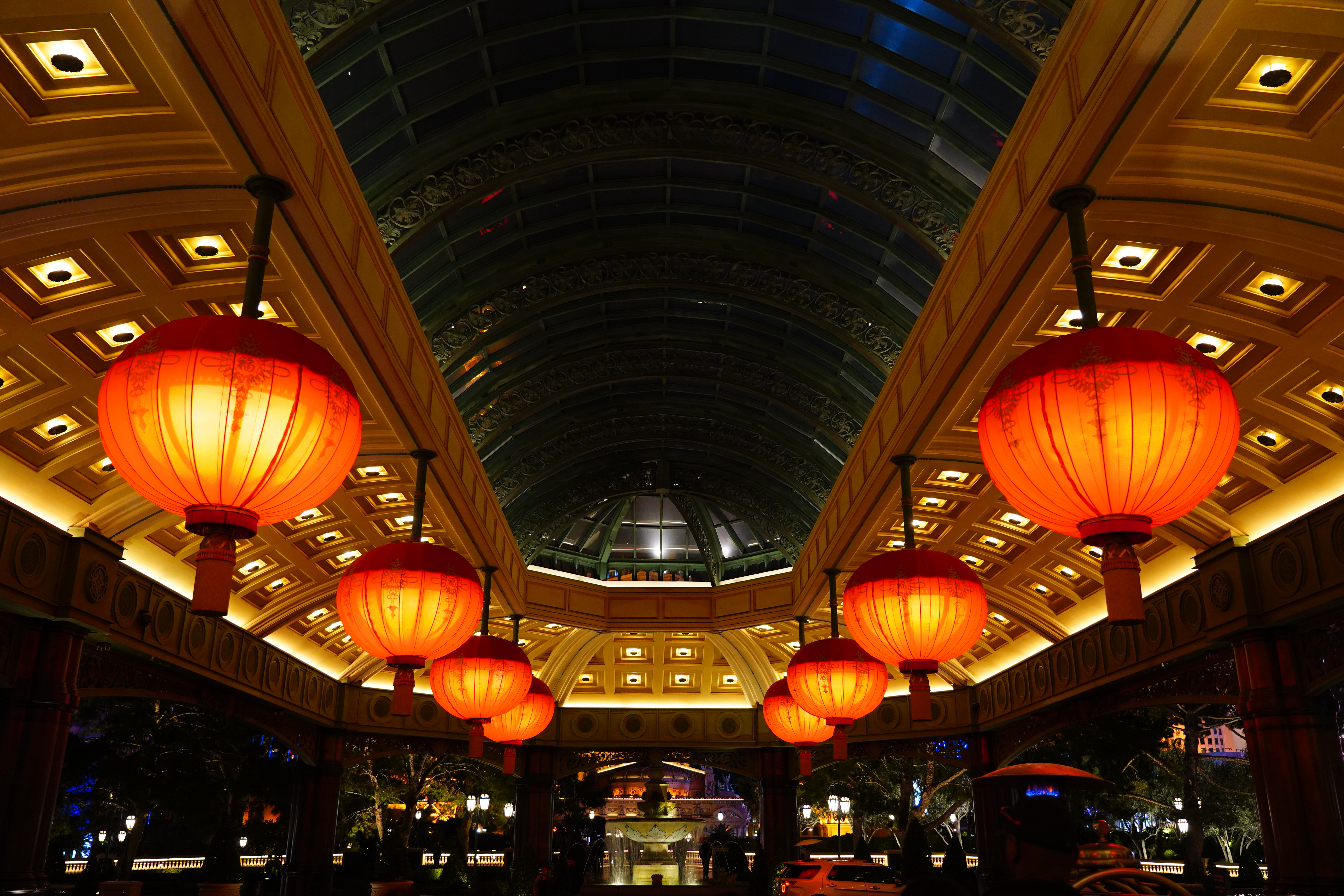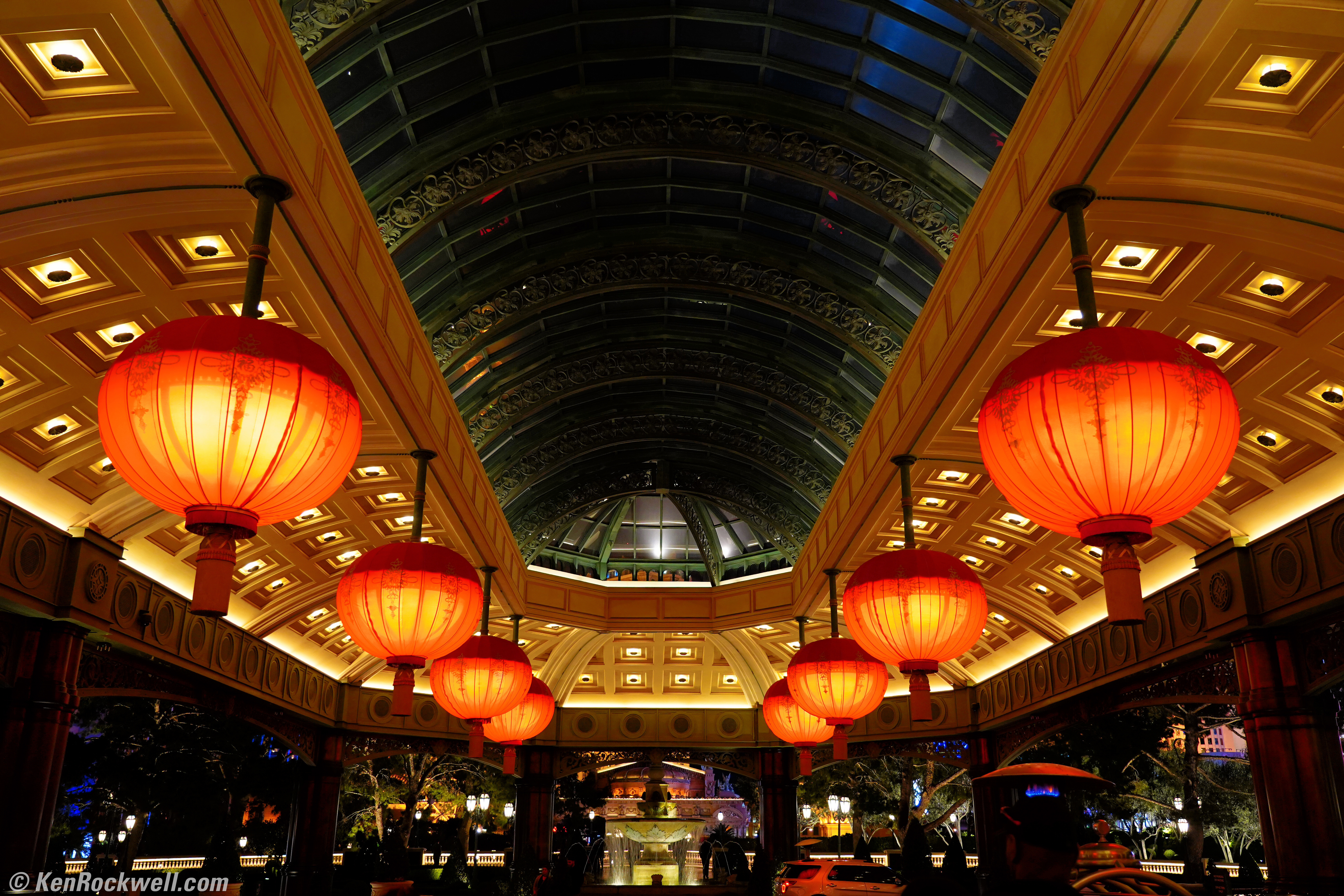 ISO 2,000Bellagio Hotel Turns Chinese, 8:06 P.M., 28 February 2018. Sony A7 III with Sony 24-105mm f/4 G at 30mm at f/4 hand-held at 1/30 at Auto ISO 2,000, Perfectly Clear. bigger, full-resolution or camera-original © JPG.