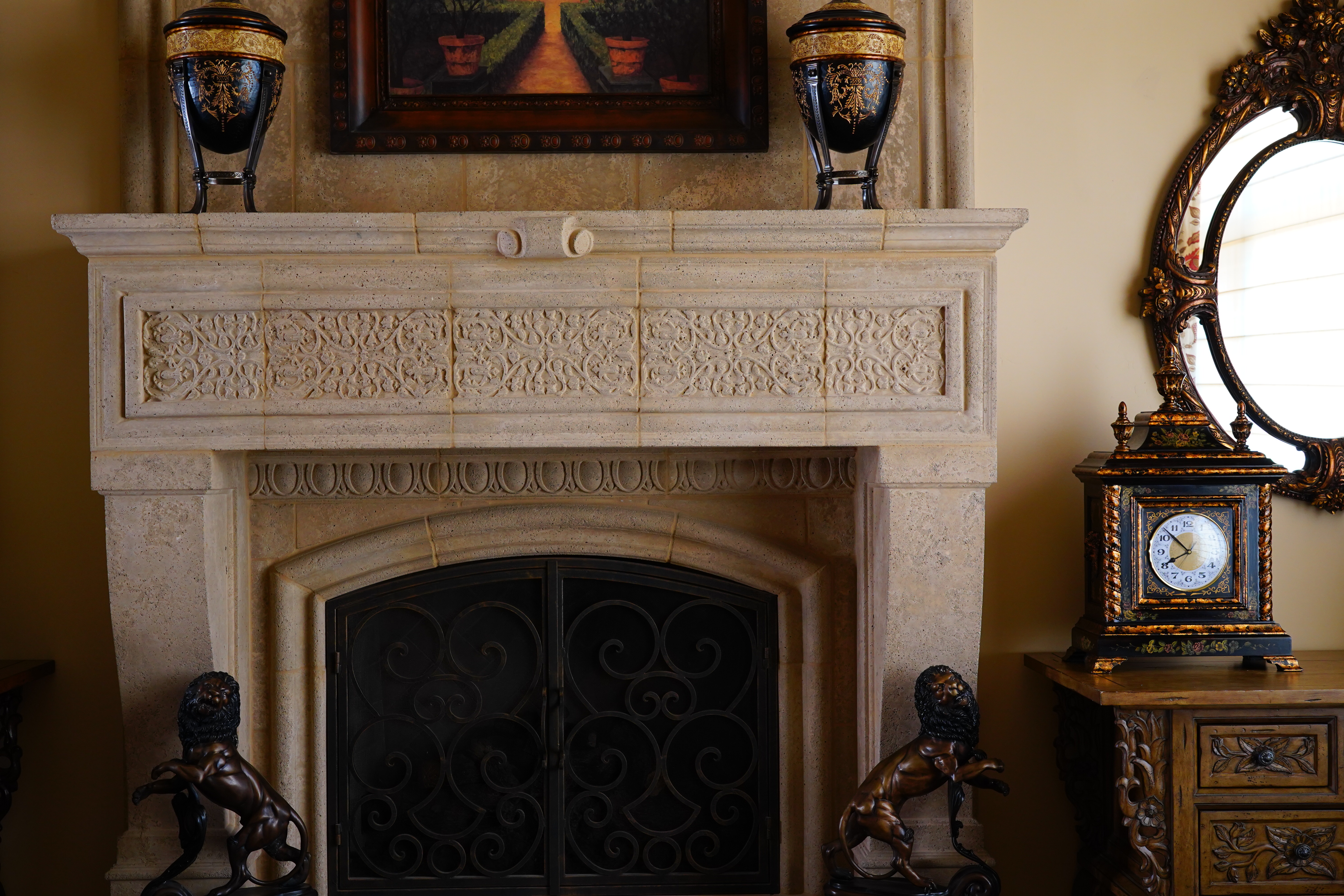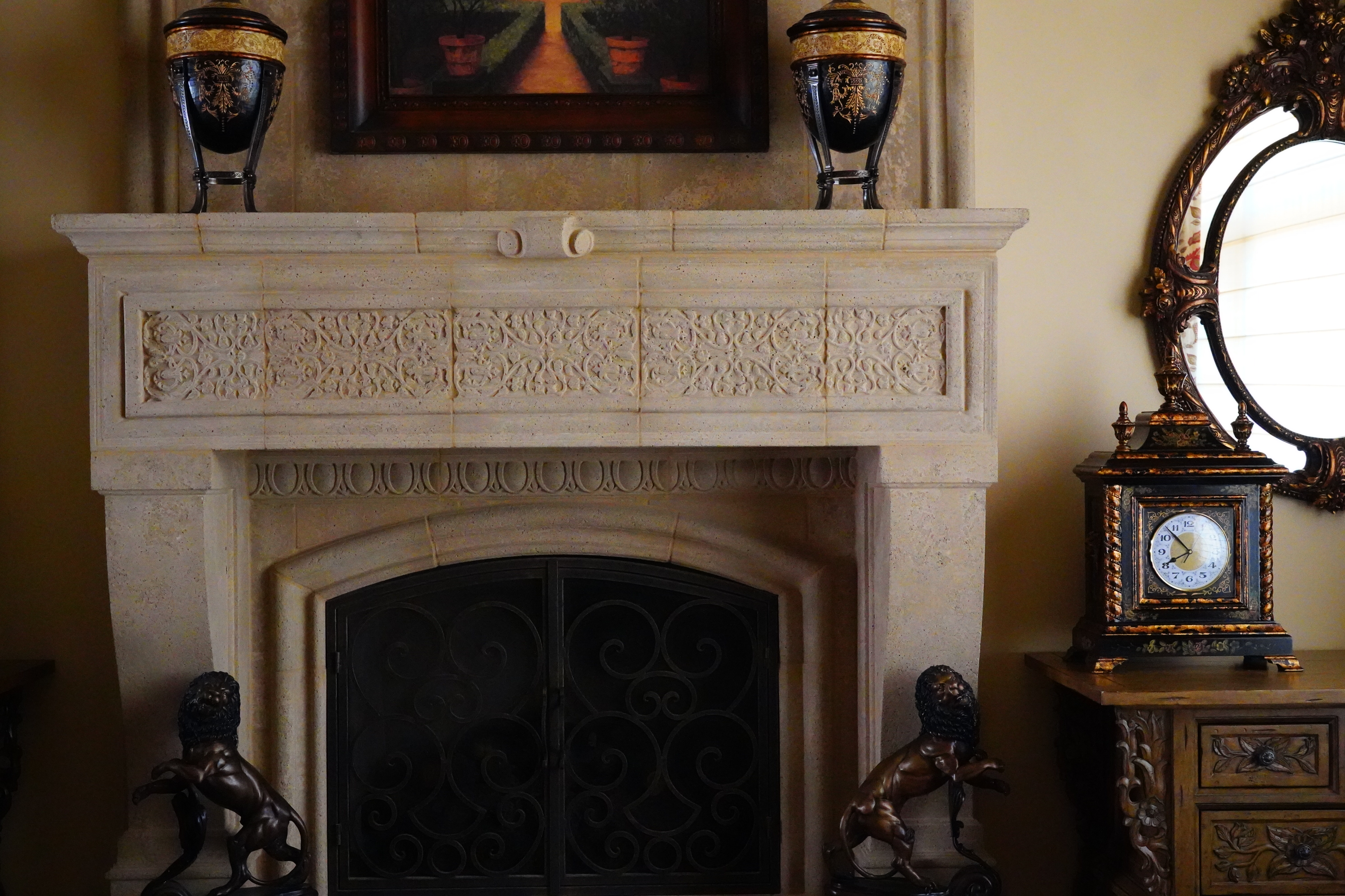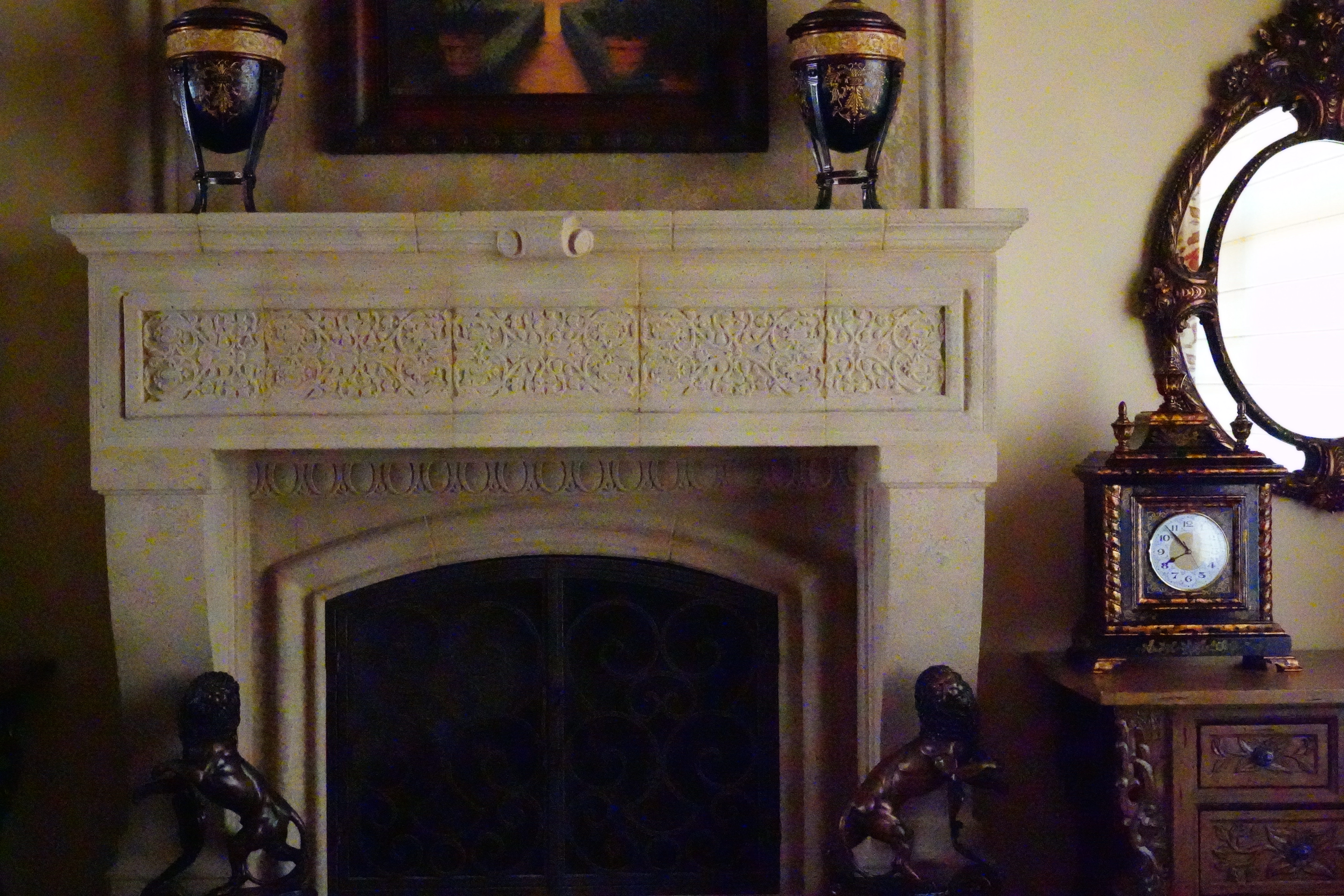 600 pixel crops of the fireplace grilleThese are 600 × 450 pixel crops that vary in size to fit your browser window. If they are about 6" (15cm) wide on your screen, the complete image would print at 40 × 60" (1 × 1.5 meters) at this same magnification. If they are about 12" (30cm) wide on your screen, the complete image would print at 80 ×120" (2 × 3 meters) at this same magnification. This is a huge magnification! As ISO climbs we lose the details in the wire screen behind the ironwork, and these dark parts of the image lose color saturation. At the highest ISOs we can't see the mesh at all! This is normal for noise reduction; digital cameras couldn't shoot at these ISOs if it weren't for these tricks. At low ISOs we can see the screen and the diamond-patten tiles at the back of the fireplace. The orange rust and wear on the ironwork is obvious, and it's in color (orange. As ISO climbs, the mesh and diamond pattens disappear and the ironwork loses saturation and goes to all gray. At the very highest ISOs colored blotches become apparent. What's weird is at ISO 102,400 I see a hint of haloing around the ironwork. No big deal, just know that all digital cameras do all sorts of fooling around with image data to give us the best pictures possible at high ISOs. I lightened all of these crops with the same curves adjustment layer in Photoshop so you could see them more clearly on this page. Click any for the same camera-original © files as above to explore on your computer (mobile devices rarely show the full resolution files properly: