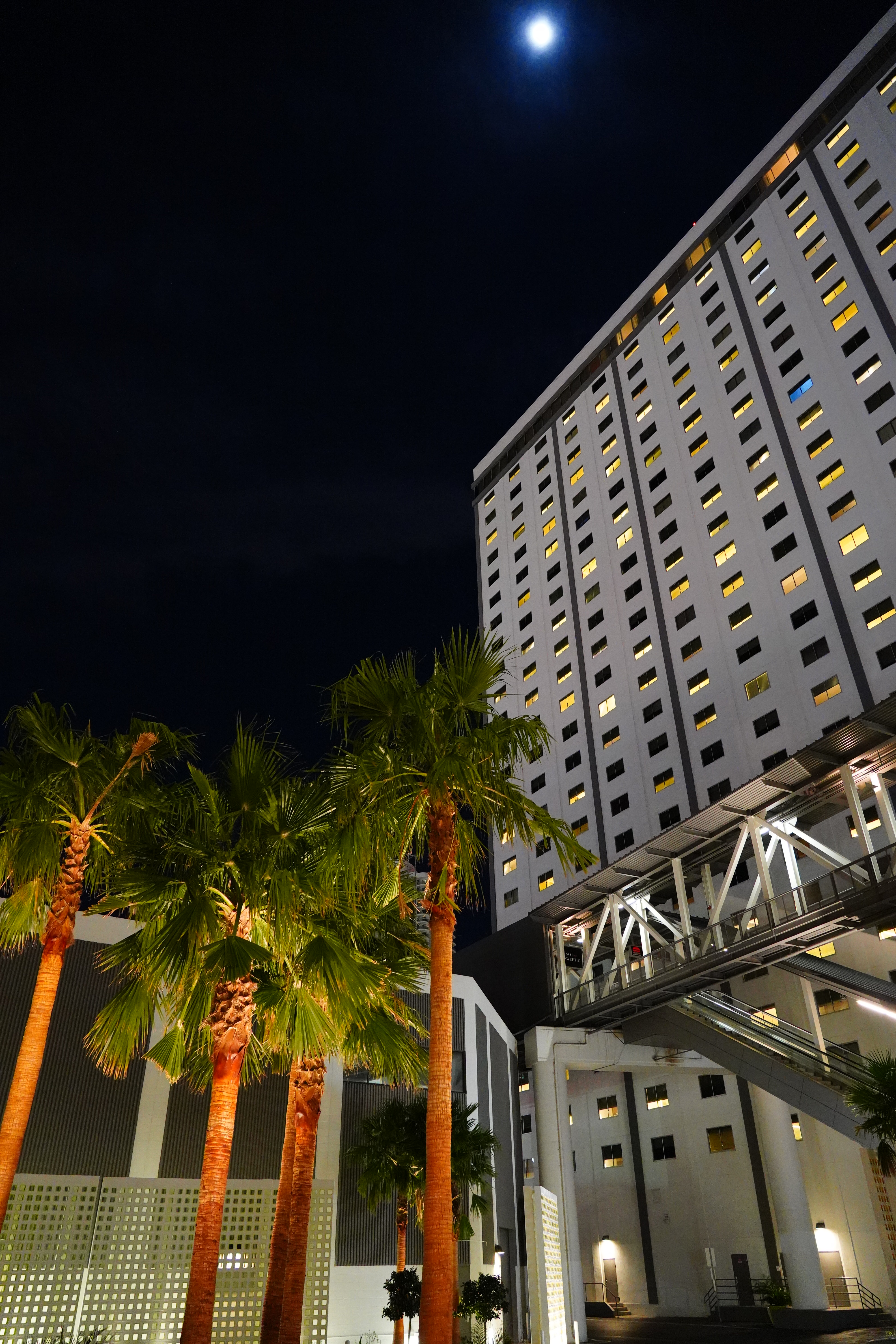 ISO 10,000Las Vegas W Hotel under Moonlight, 8:23 P.M., 26 February 2018. Sony A7 III with Sony 24-105mm f/4 G at 24mm at f/4 hand-held at 1/30 at Auto ISO 10,000, Perfectly Clear. bigger, full-resolution or camera-original © JPG.