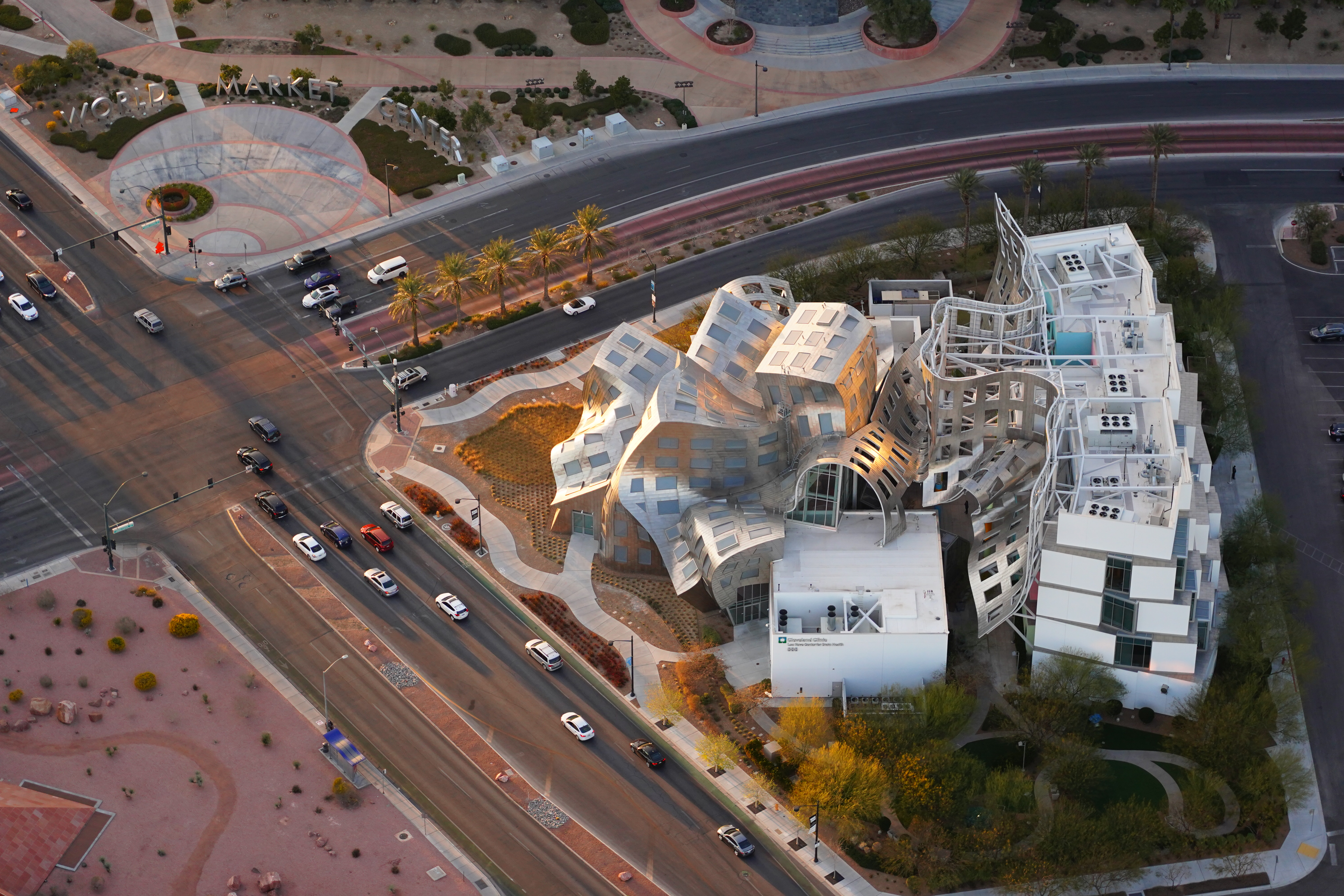 ISO 1,250Aerial view of Frank Gery's brain-damaging Lou Rumor Brain Health Center, Las Vegas, 5:12 P.M., 28 February 2018. Sony A7 III with Sony 24-105mm f/4 G at 105mm at f/4 at 1/1,000 at Auto ISO 1,250, Perfectly Clear. bigger, full-resolution or camera-original © JPG.