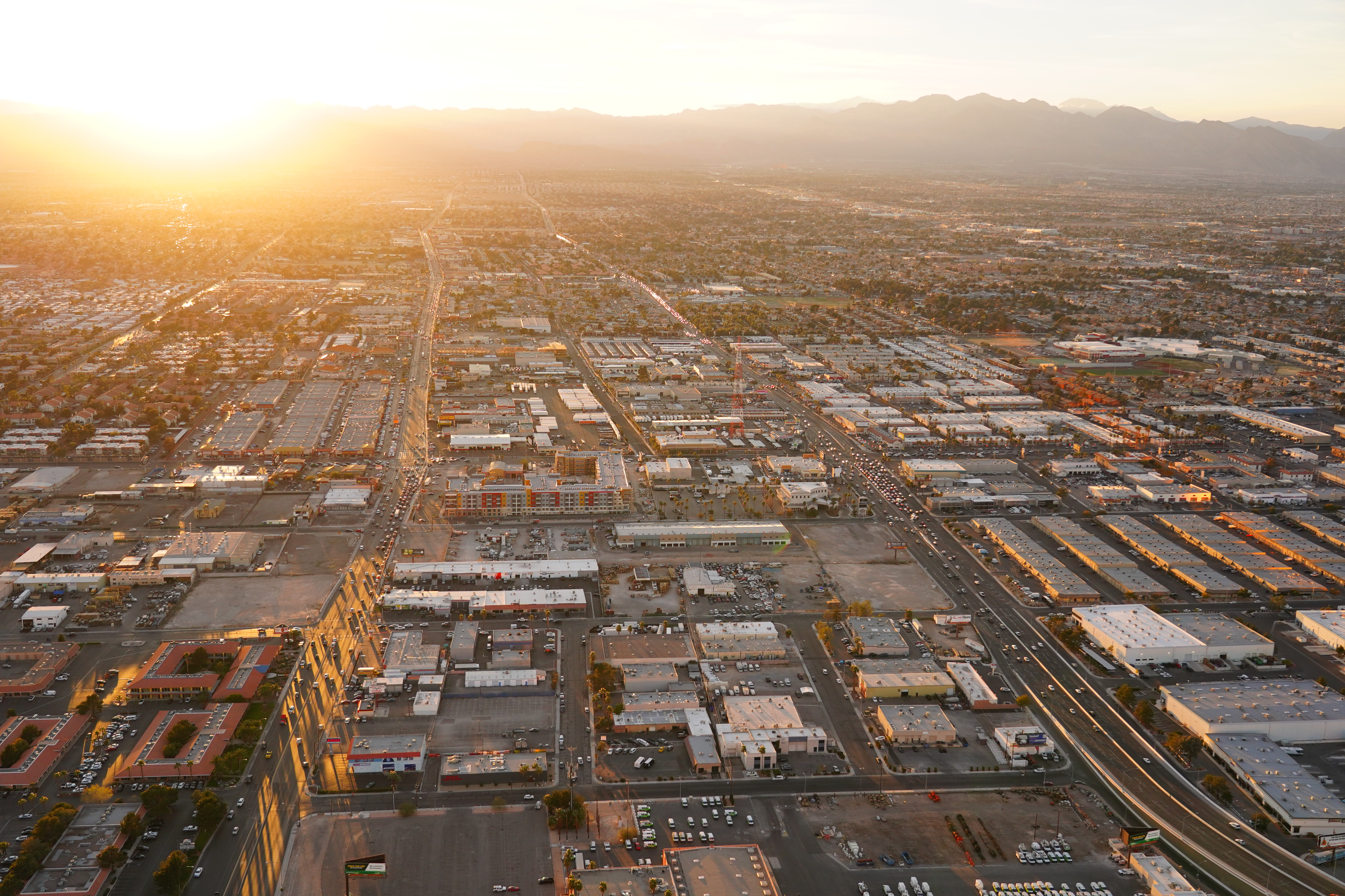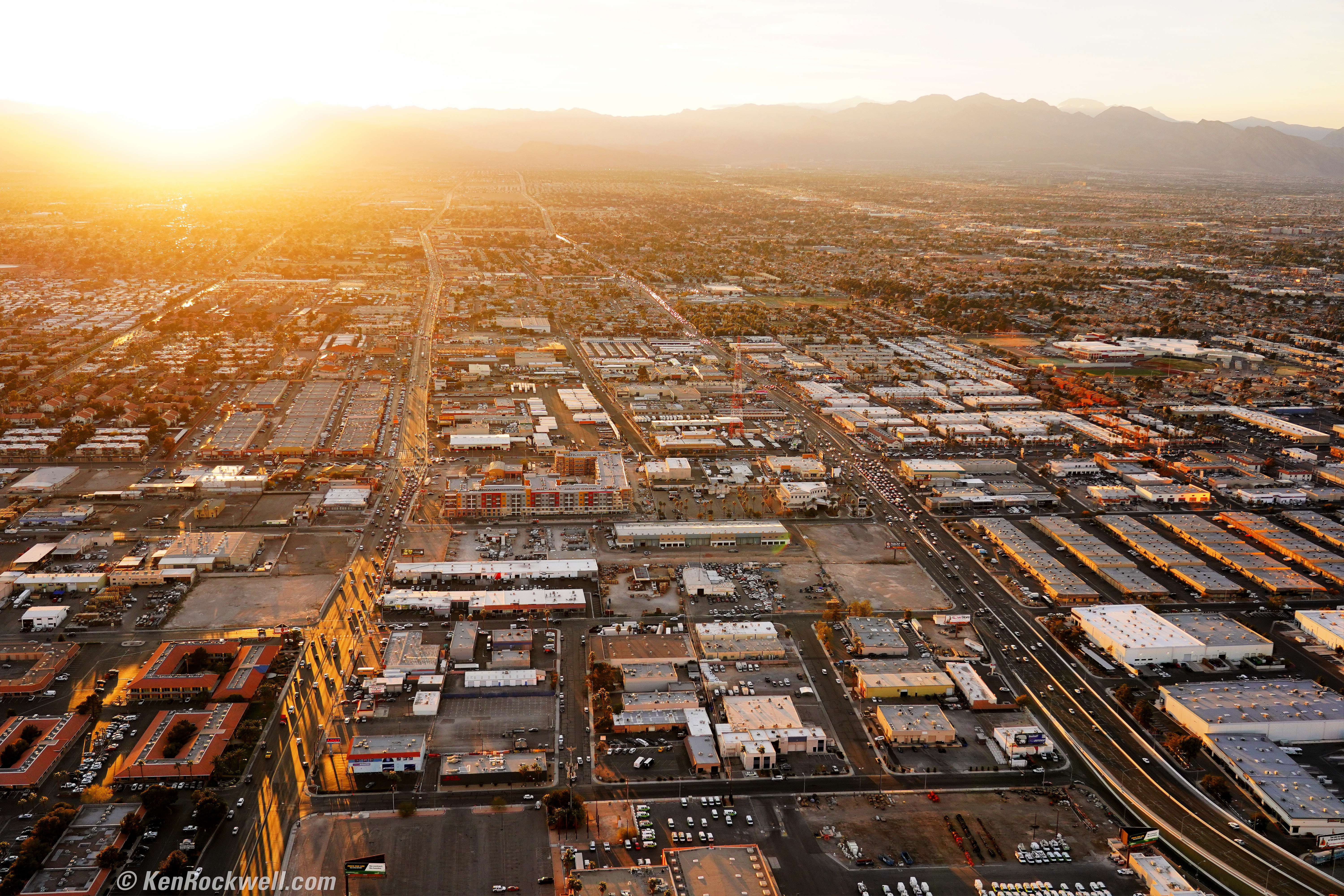 ISO 500Aerial view towards Red Rock from the Las Vegas Strip at sunset, 5:14 P.M., 28 February 2018. Sony A7 III with Sony 24-105mm f/4 G at 34mm at f/4 at 1/1,000 at Auto ISO 500, Perfectly Clear. bigger, full-resolution or camera-original © JPG.