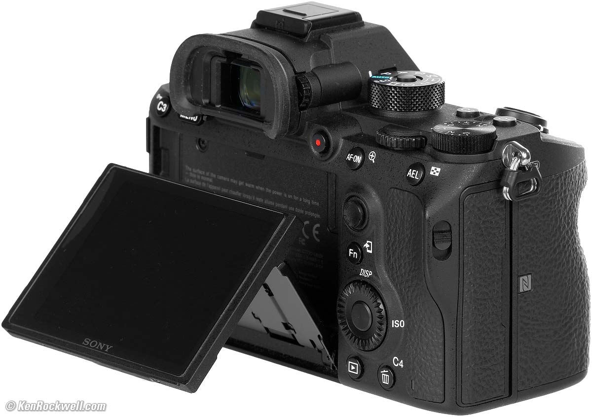 LCDFlipping LCD, Sony A7R III. bigger. 3" TFT LCD. 1,440,000 dots. Flips, but can't flip 180º for self-portraits. Only flips up 107º or down 41.º Does not swing left or right. Manual brightness control only. There is a "Sunny" mode, too. Touch screen to move focus area, but not for menus or playback.