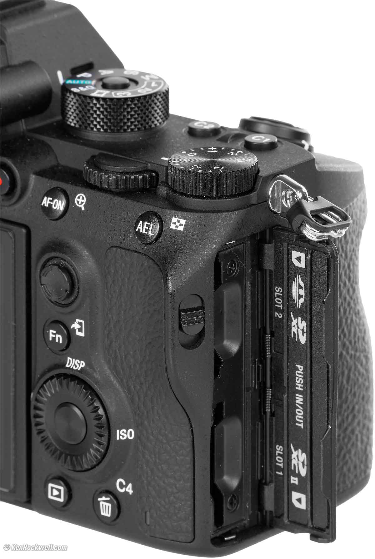 ErgonomicsIt turns on immediately. The A7R III has so many programmable buttons that it's easy to get it set up the way we'd like. Memory cards go in with the label away from you. Oddly card 1 is on the bottom and card 2 is on the top; which you'll need to know when you set what records to which. Unlike Nikon and Canon pro DSLRs whose physical design has been refined over many decades and whose cameras feel soft and comfortable due to their expertly designed curves, the A7R III feels blocky because it is. The A7R III is mostly straight lines and hard edges, and feels that way. The mode dial locks. In P, S and A modes the front and rear dials both control the same thing; use whichever you prefer. The battery goes in backwards from what you'd expect: instead of the curved side facing the curved outside of the grip into which it slides, the square side of the battery faces the outside curved part of the grip and the battery's curved side faces in. I'm always getting confused since it's counterintuitive.