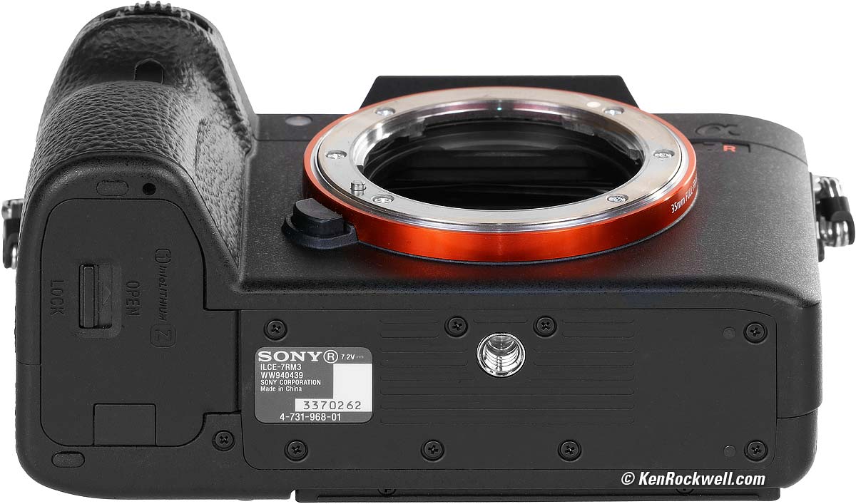 Quality Made in China: Bottom, Sony A7R III. bigger. Magnesium alloy top cover, front cover, internal frame and rear cover. The grip area has been reinforced with magnesium alloy. Sony claims weather seals around most of the buttons and dials, but there are no seals on the card and connector covers.