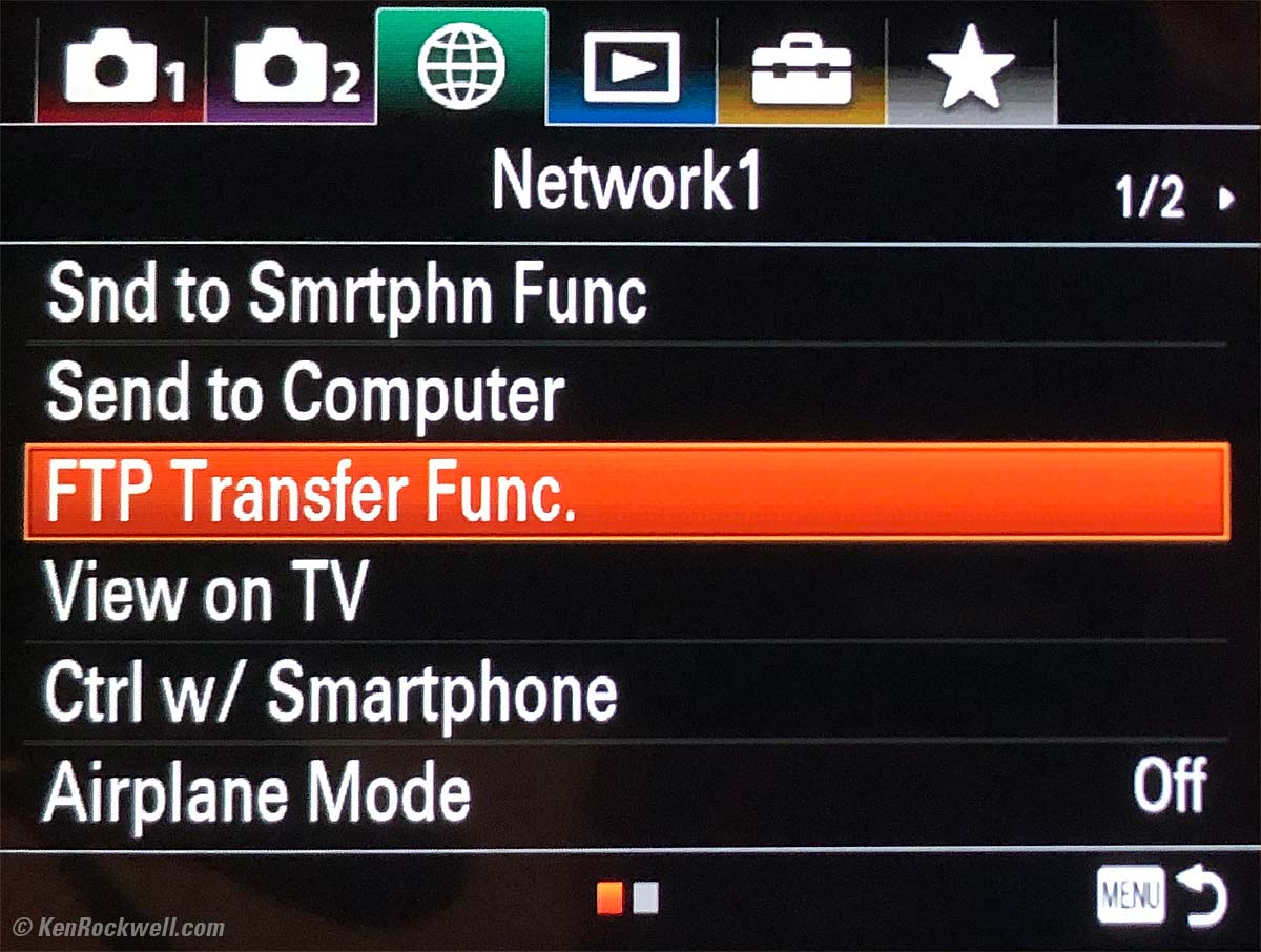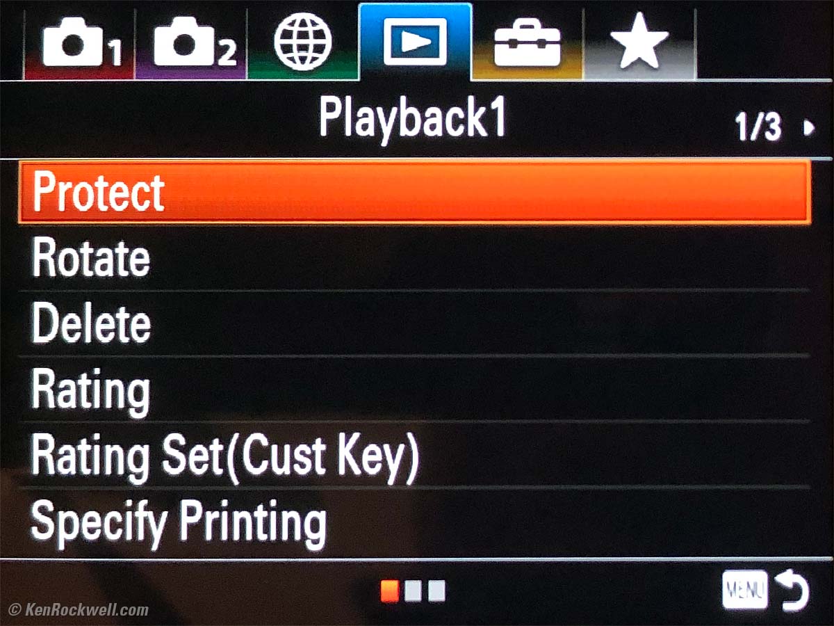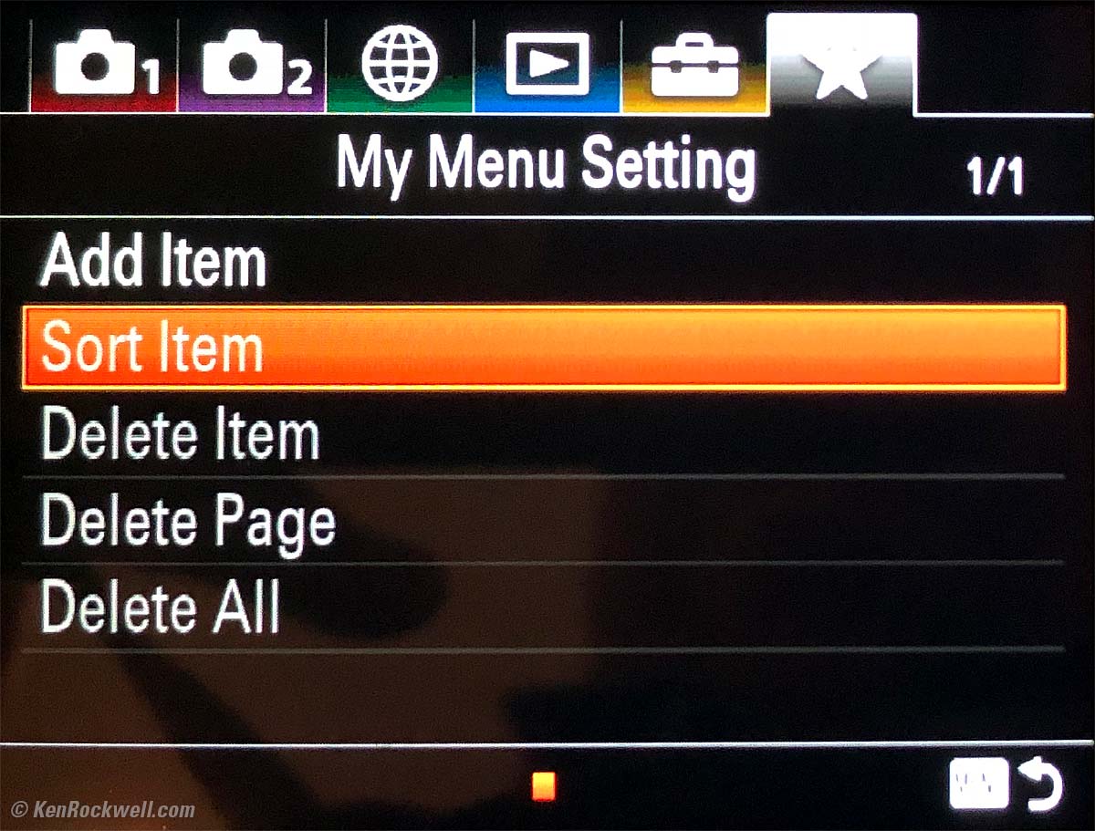 Menu SystemSony's menu system is the worst in the business. While the tiny top tabs seem like they are color coded, the big highlights for every menu item are orange, so every item looks the same as you can see below. You just can't recall where to find it by color as you can with Canon. Instead, you have to look through every page to find just about anything you haven't saved to MY MENU. Every page in each of the six main categories is distinct; you get to each next page with a single left or right click, and each item always is in the same place on the page. As the last image shows, once you're in a menu item to set it, again it's all orange so there is no color to help remind you of where to find it next time.