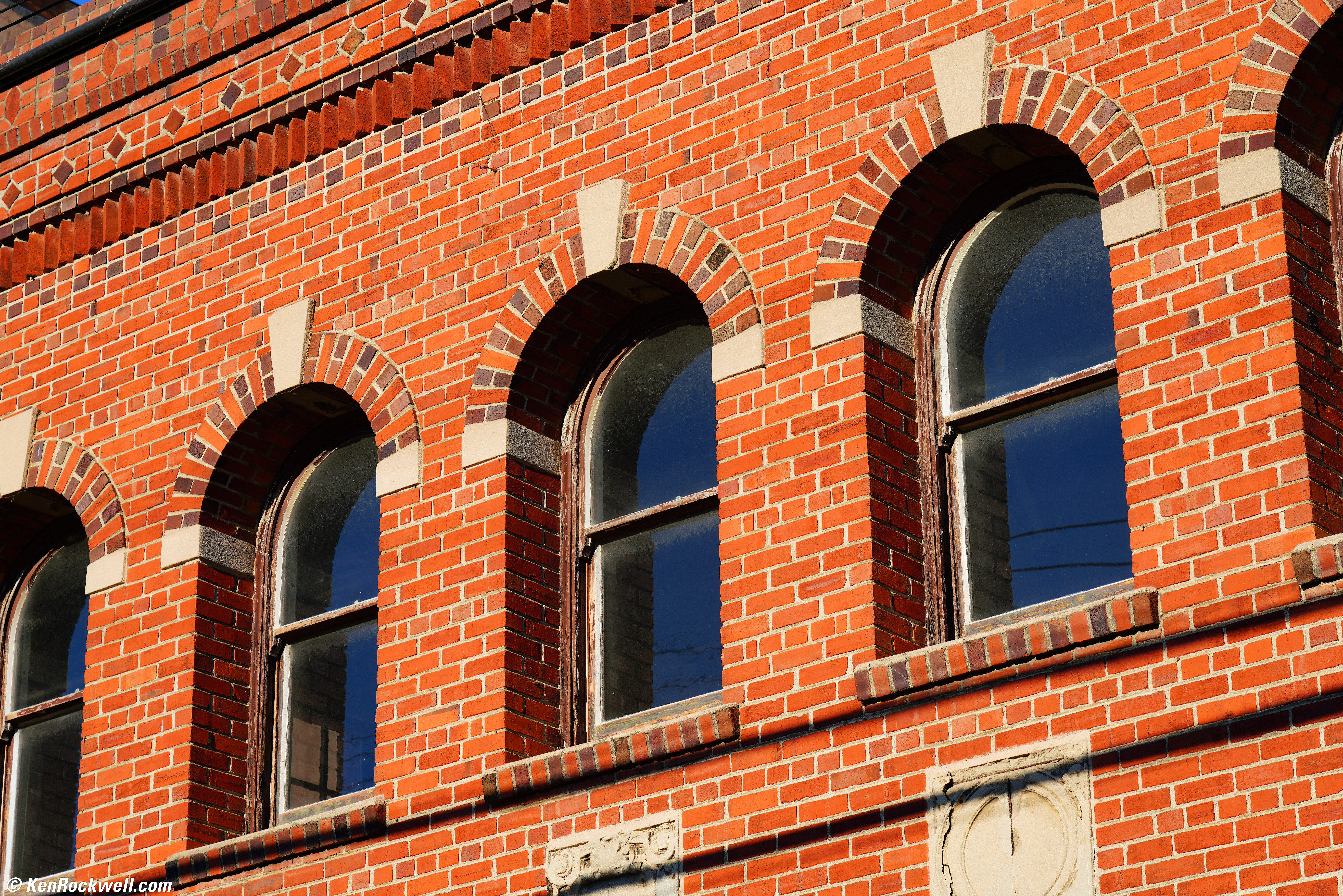Three Brick Windows, San Francisco, 5:54 P.M., 16 September 2018. Sony A7R III with Sony 24-105mm f/4 G at 93mm at f/7.1 at 1/320 at Auto ISO 100, Perfectly Clear. bigger or full-resolution.