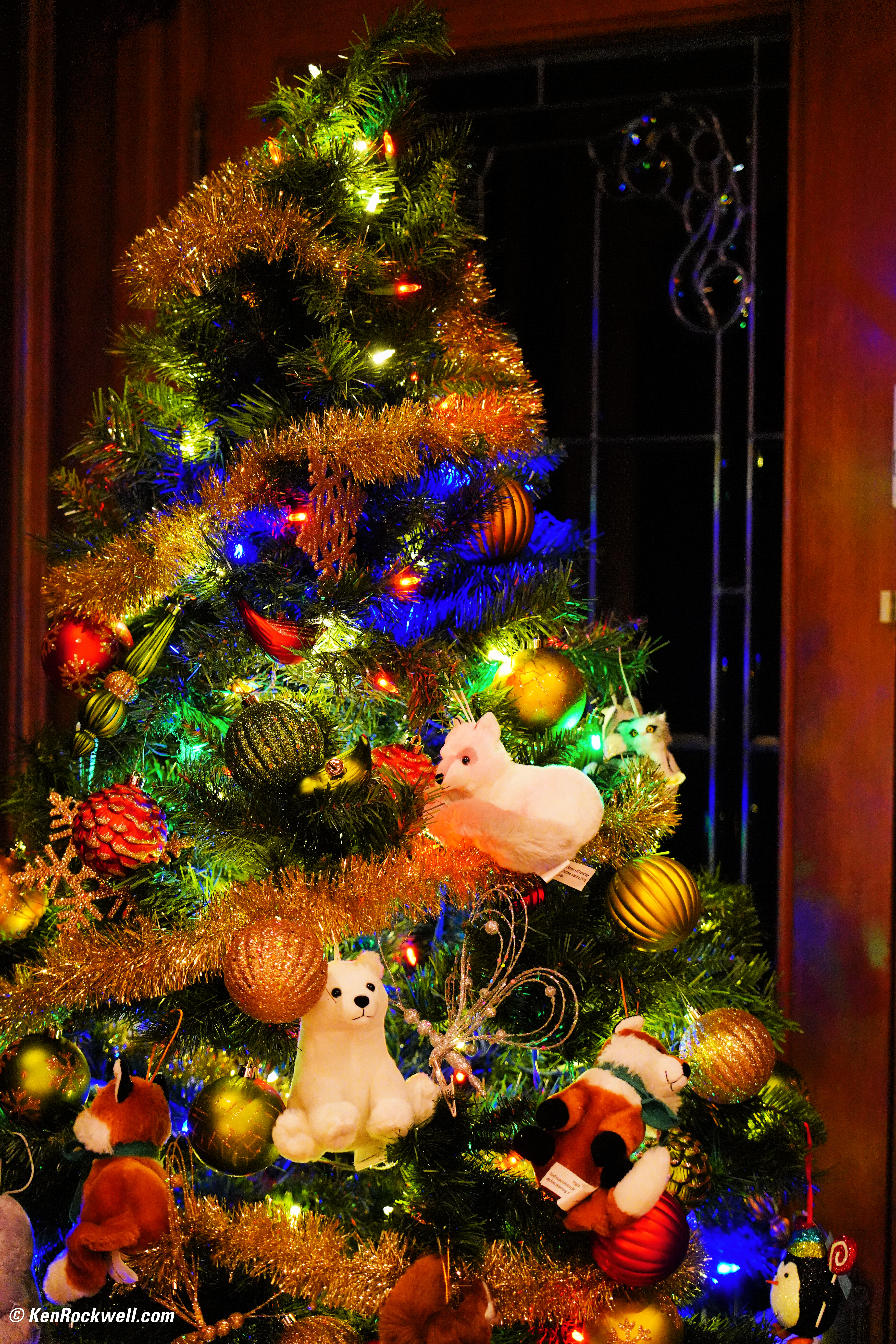 ISO 6,400Christmas Tree 6:30 P.M., 15 December 2017. Sony A7R III with Sony 24-105mm f/4 G at 94mm at f/4 at 1/50 hand-held at Auto ISO 6,400, Perfectly Clear. bigger, full-resolution file or camera-original © JPG. This is shot wide-open so very little is in focus due to the slim depth-of-field, and you can still see how sharp, clean and colorful is this image, even in dim light hand-held at slow speeds.