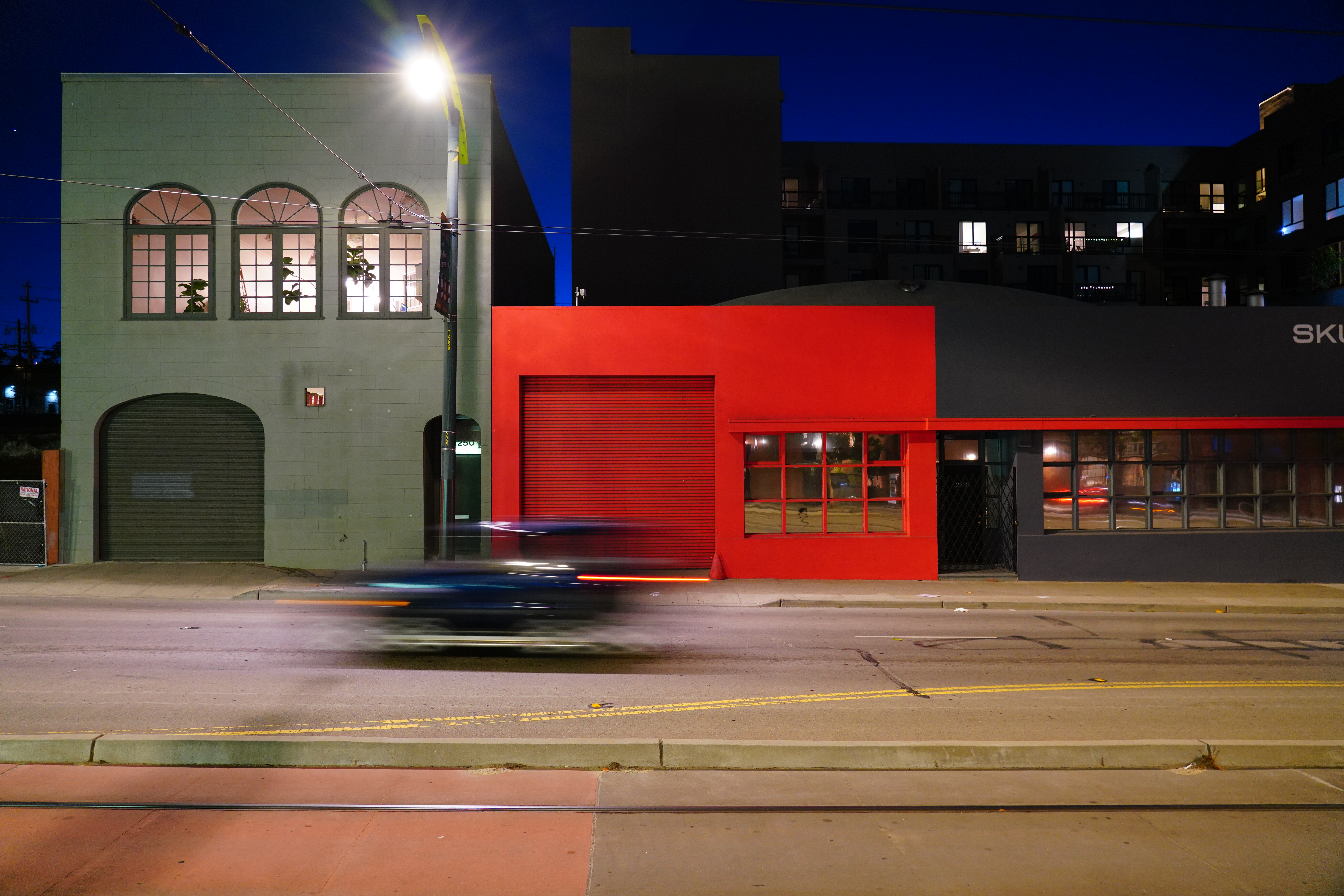 Blue, Green and Red, Third Street, San Francisco, 8:02 P.M., 16 September 2018. Sony A7R III with Sony 24-105mm f/4 G at 24mm at f/4 at 1/5 hand-held at ISO 1,600, Perfectly Clear. bigger, full-resolution or camera-original © JPG.