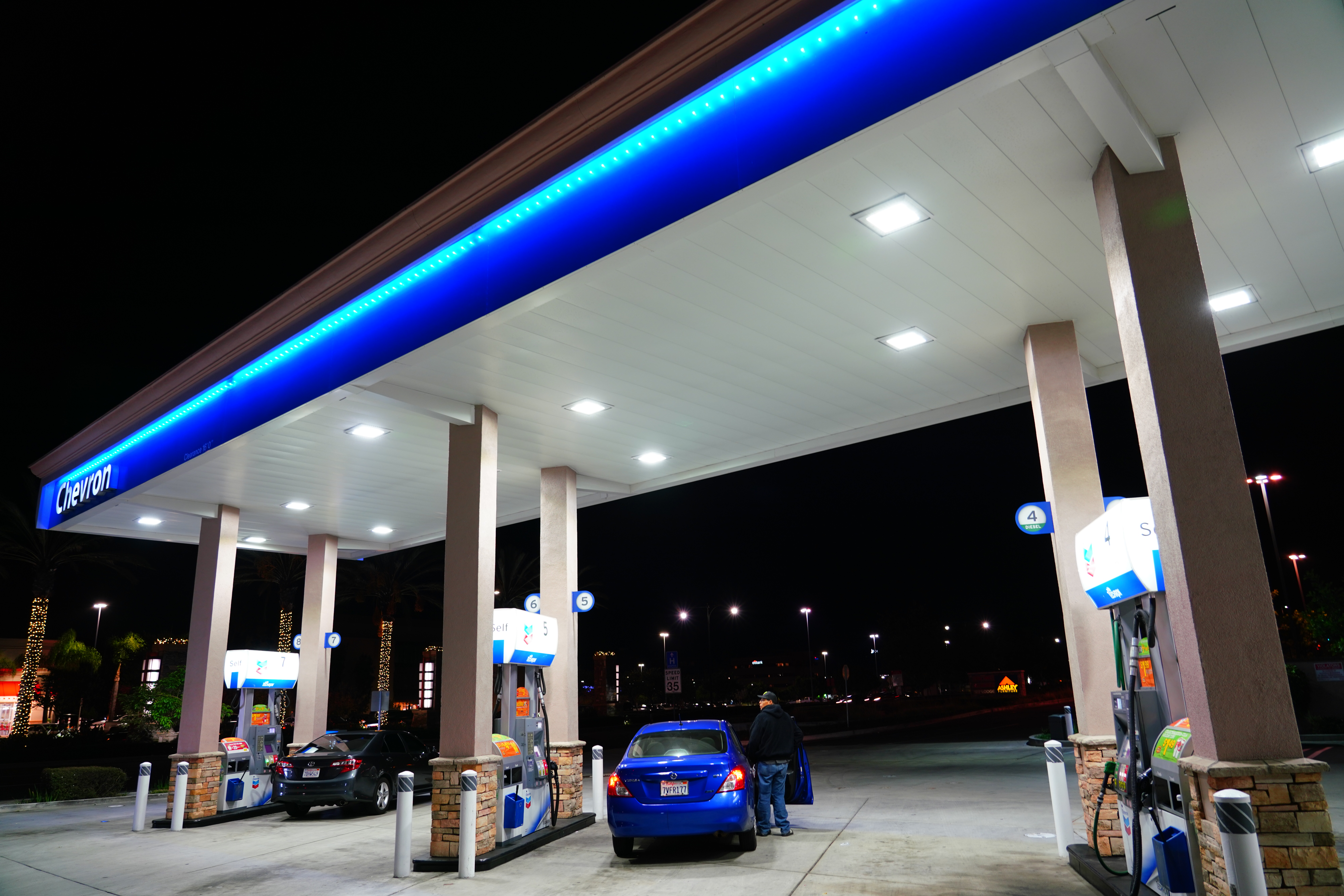 Chevron by Mimi's, 9 P.M., 15 December 2017. Sony A7R III with Sony 24-105mm f/4 G at 24mm at f/4 at 1/15 hand-held at Auto ISO 400, Perfectly Clear. bigger, full-resolution file or camera-original © JPG.