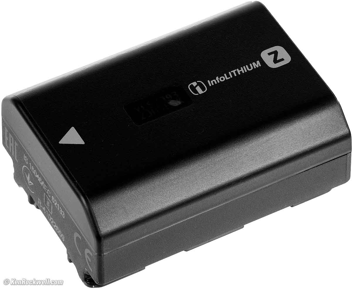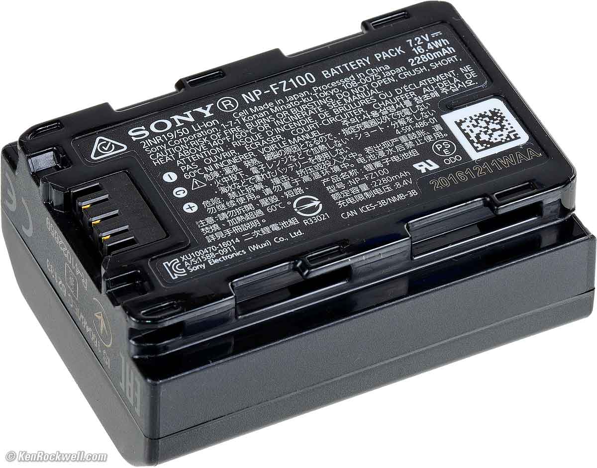 Sony NP-FZ100 battery. enlarge. It's 7.2V, 2,280 mAh, 16.4 Wh. Rated 650 still shots or 115 minutes of video shooting with the rear LCD Rated 530 still shots or 100 minutes of video shooting with the viewfinder.