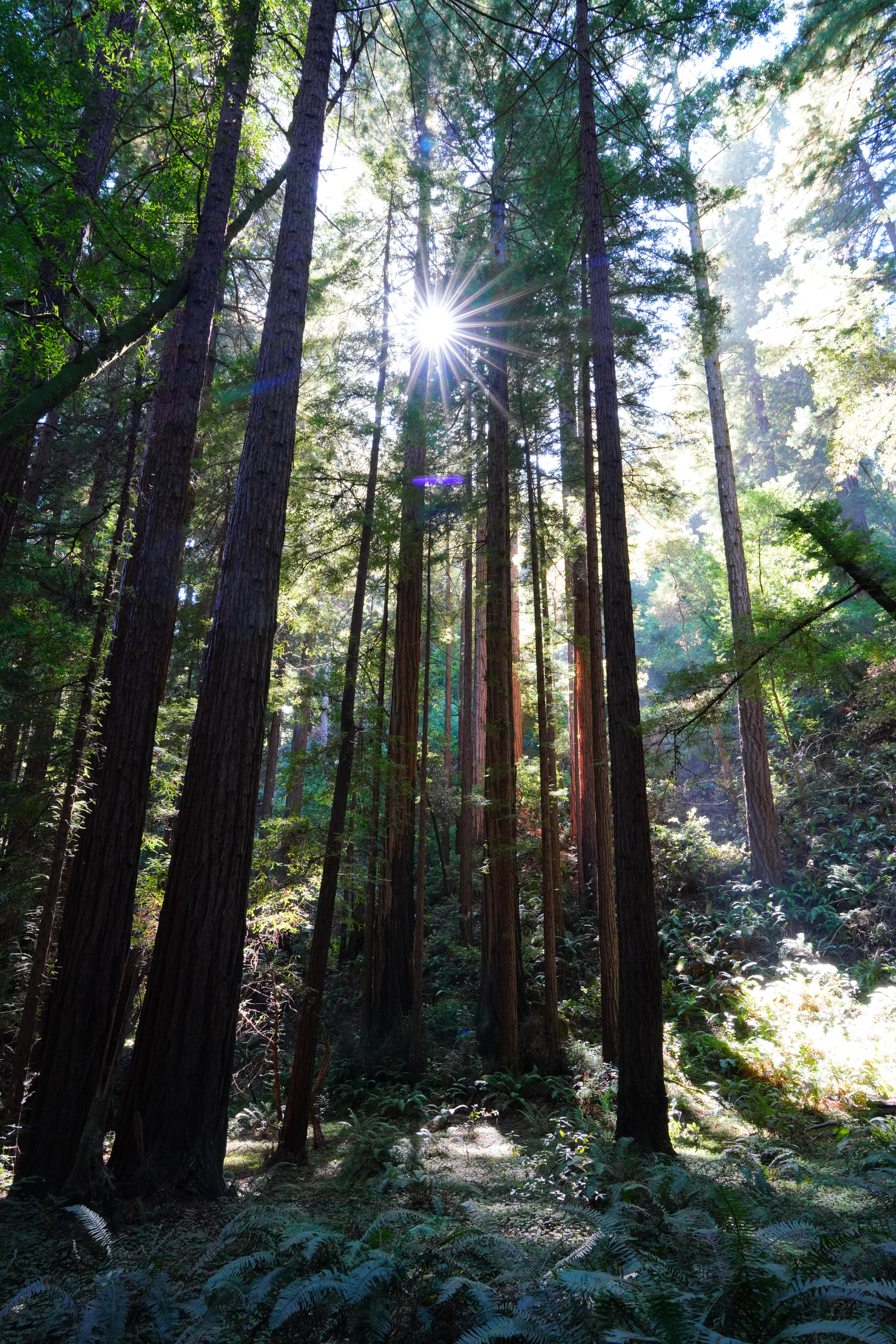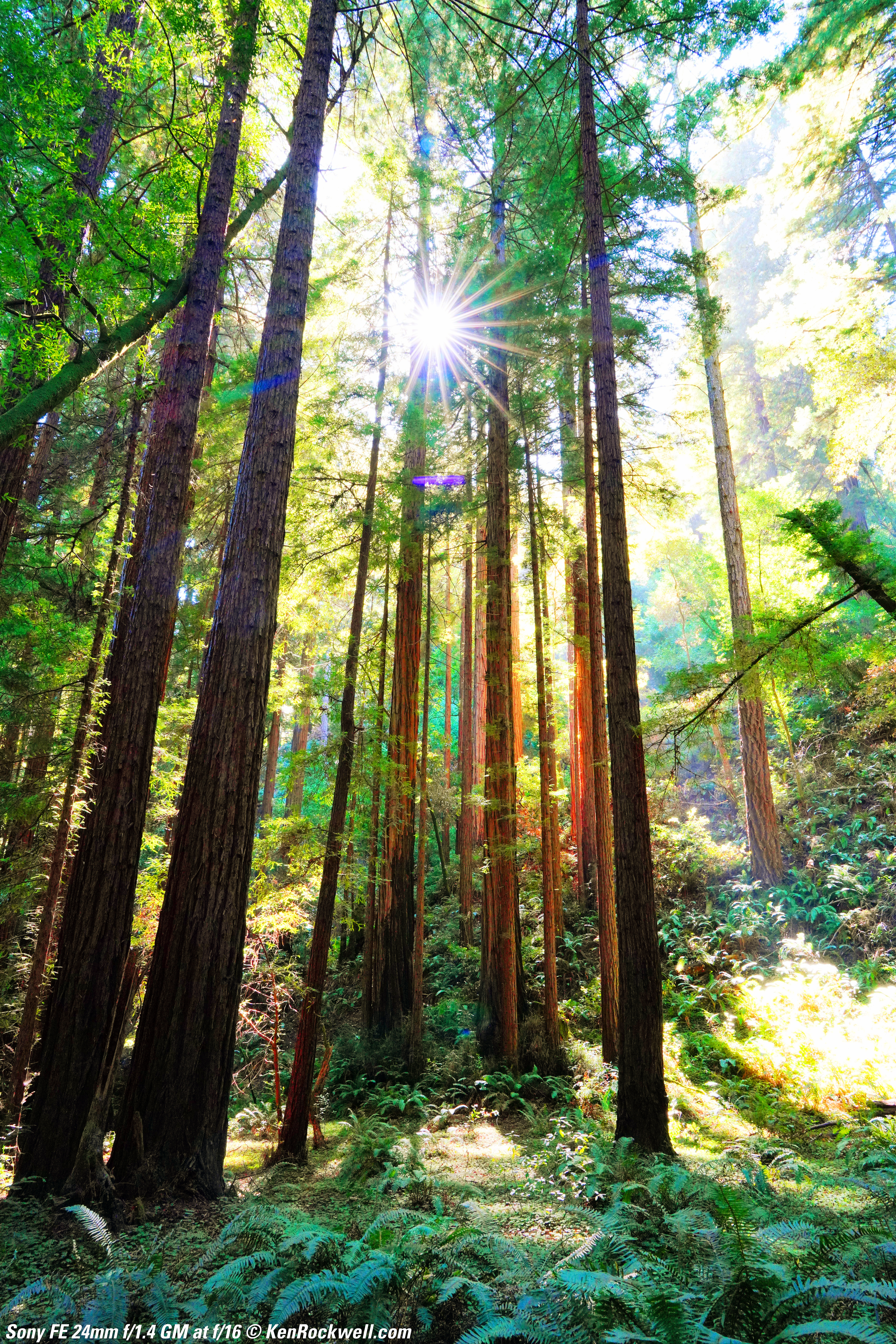 ISO 1,600Redwood Trees in Muir Woods with Sunstar, 2:55 P.M., 17 September 2018. Sony A7R III with Sony FE 24mm f/1.4 GM at f/16 at 1/15 at Auto ISO 1,600, Perfectly Clear. bigger, full-resolution or camera-original © file.