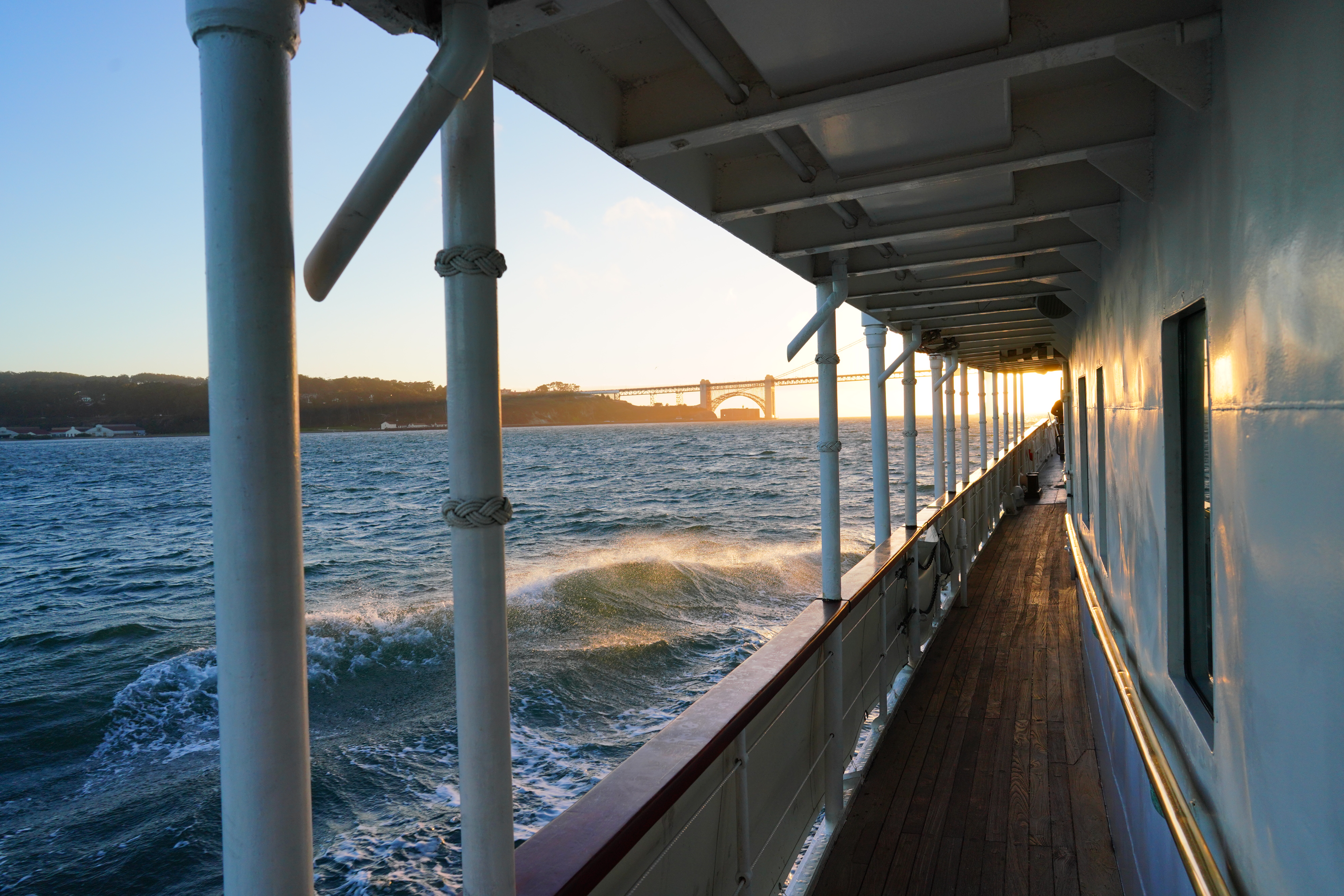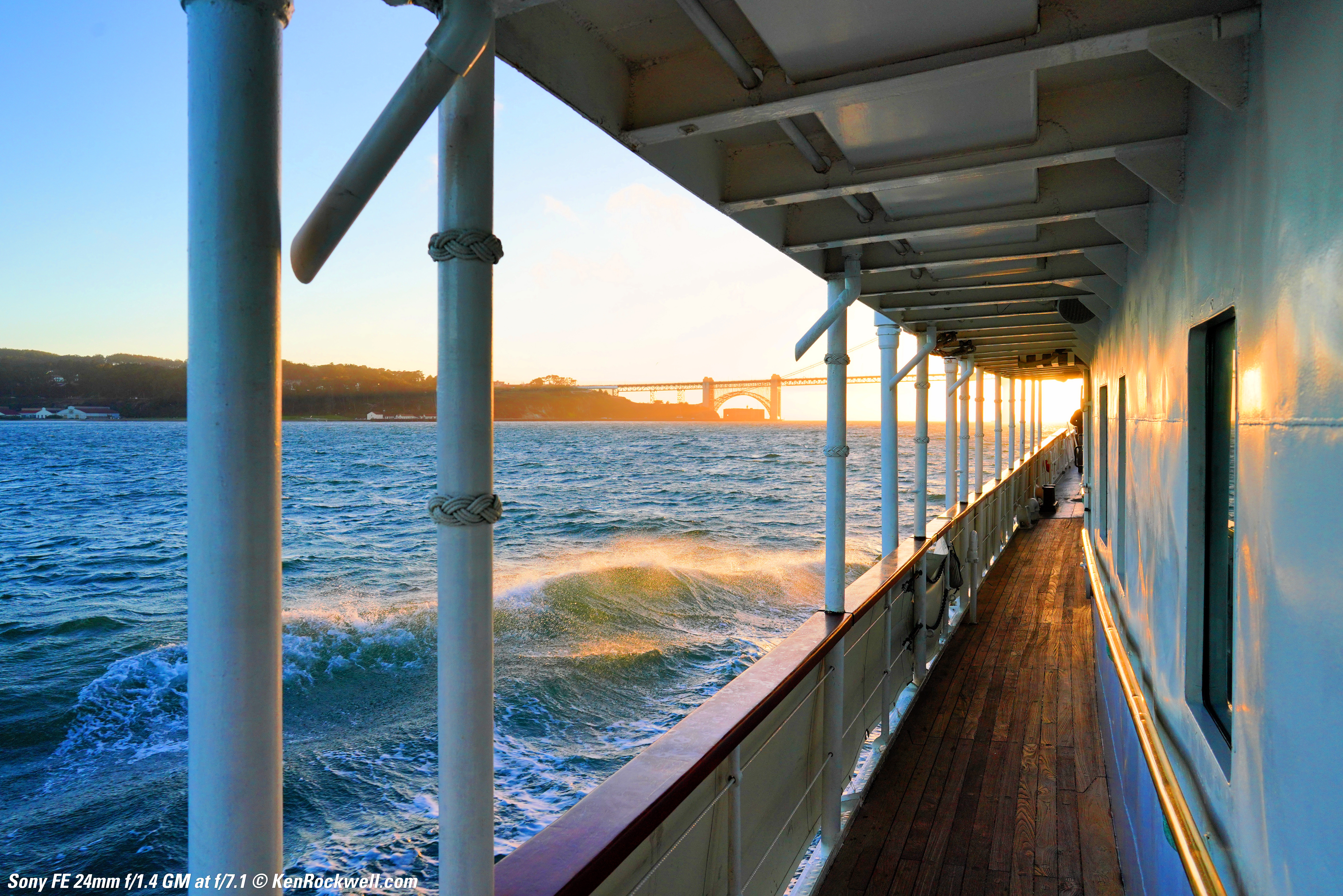 ISO 500Sunset over the Golden Gate Bridge with Backlit Waves as Seen from the San Francisco Bay aboard the USS Potomac, 6:57 P.M., 17 September 2018. Sony A7R III with Sony FE 24mm f/1.4 GM at f/7.1 at 1/400 at Auto ISO 500, Perfectly Clear. bigger, full-resolution or camera-original © file.