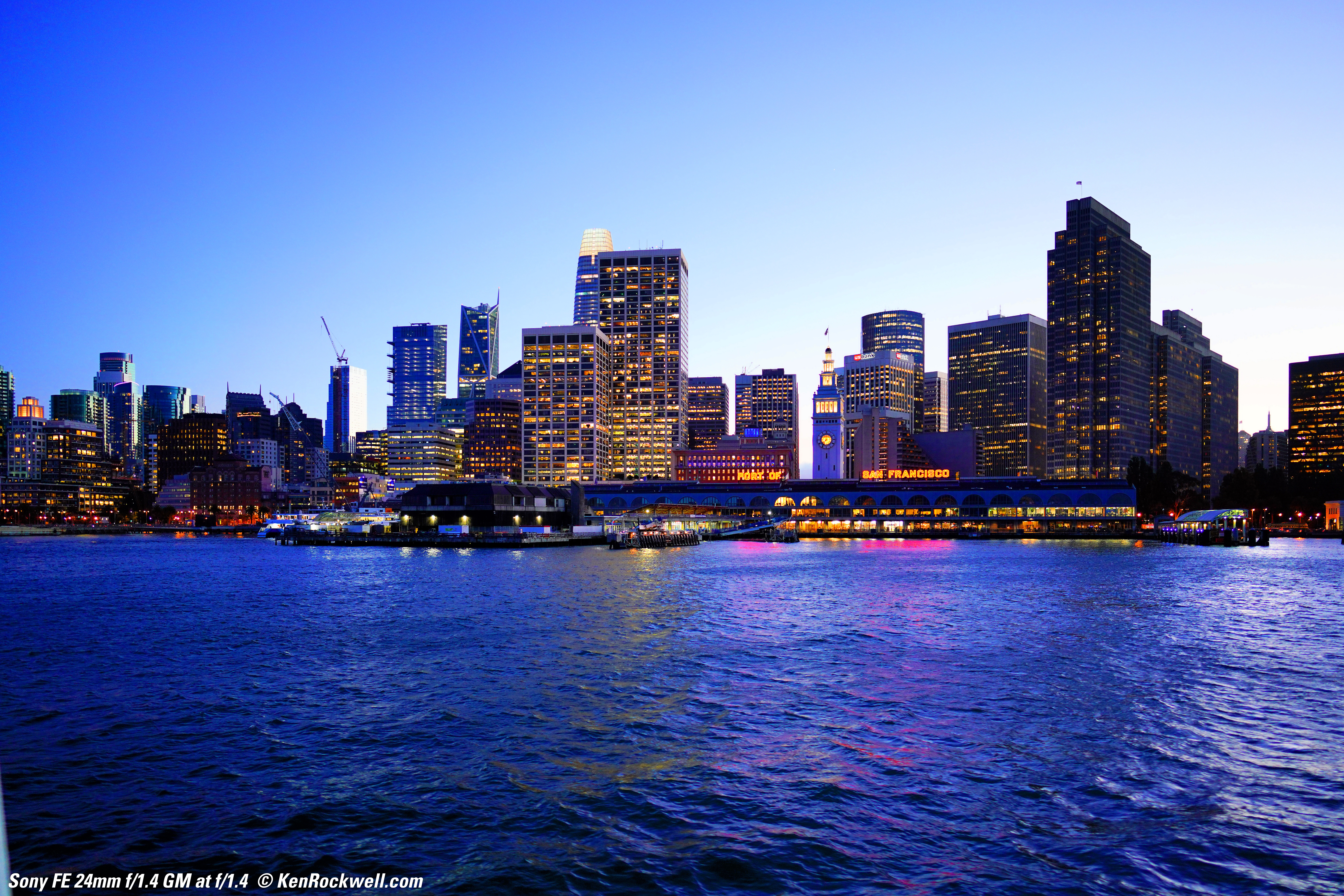 San Francisco Skyline at Dusk as Seen from the San Francisco Bay, 7:34 P.M., 17 September 2018. Sony A7R III with Sony FE 24mm f/1.4 GM at f/1.4 at 1/60 at ISO 400, Perfectly Clear. bigger, full-resolution or camera-original © file.