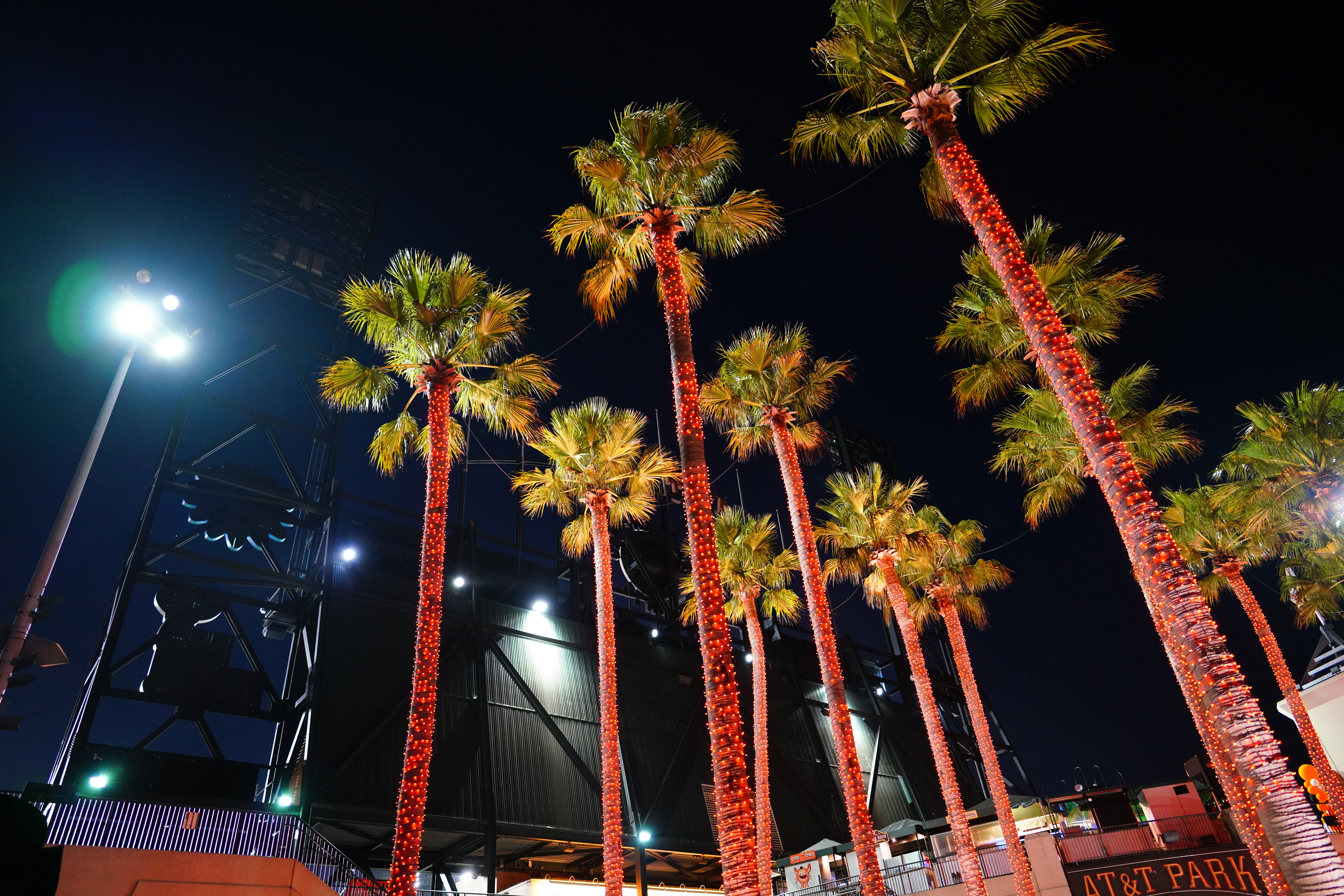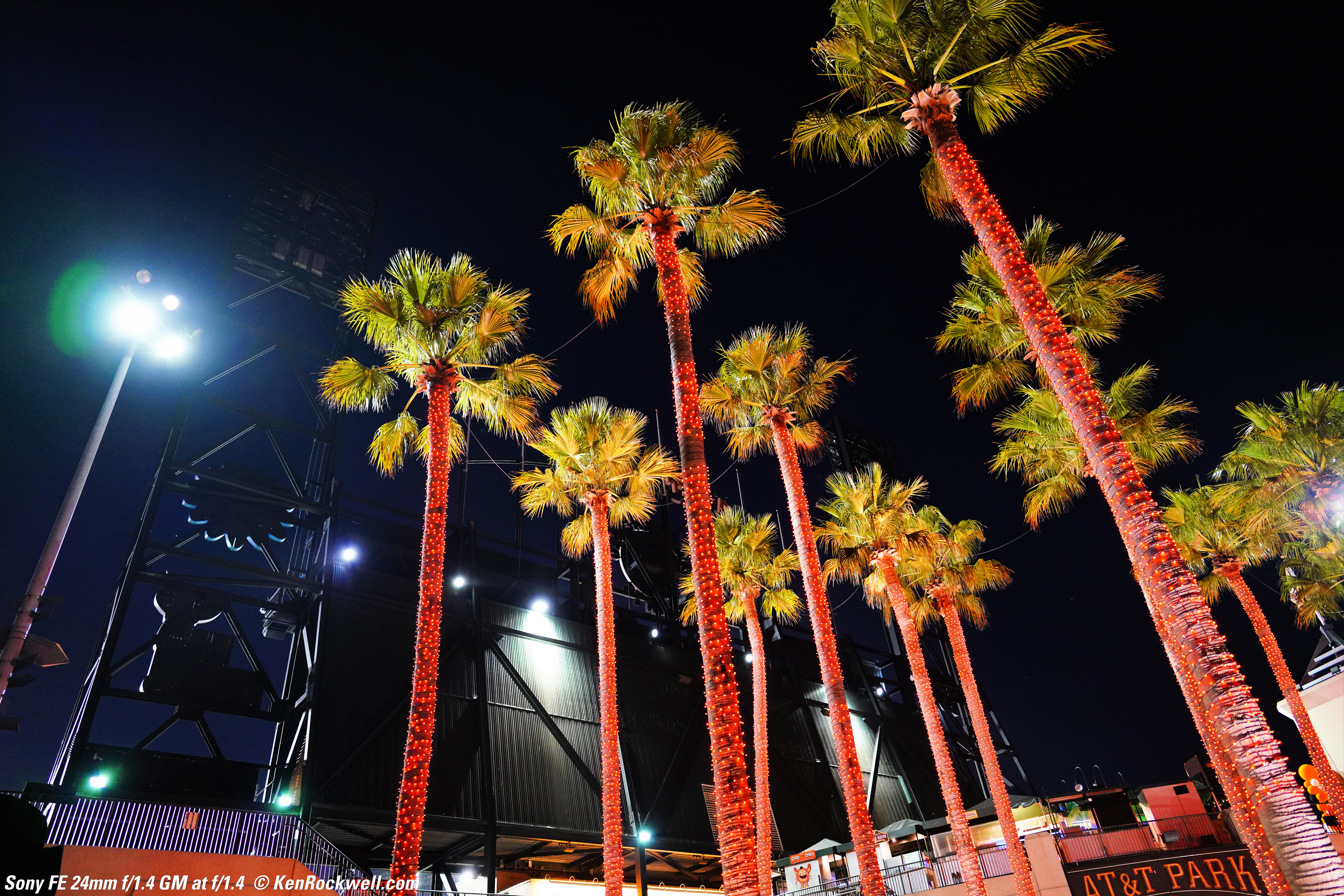 ISO 2,000Palm Trees at Night, AT&T Park, San Francisco, 8:04 P.M., 17 September 2018. Sony A7R III with Sony FE 24mm f/1.4 GM at f/1.4 at 1/60 at Auto ISO 2,000, Perfectly Clear. bigger, full-resolution or camera-original © file.