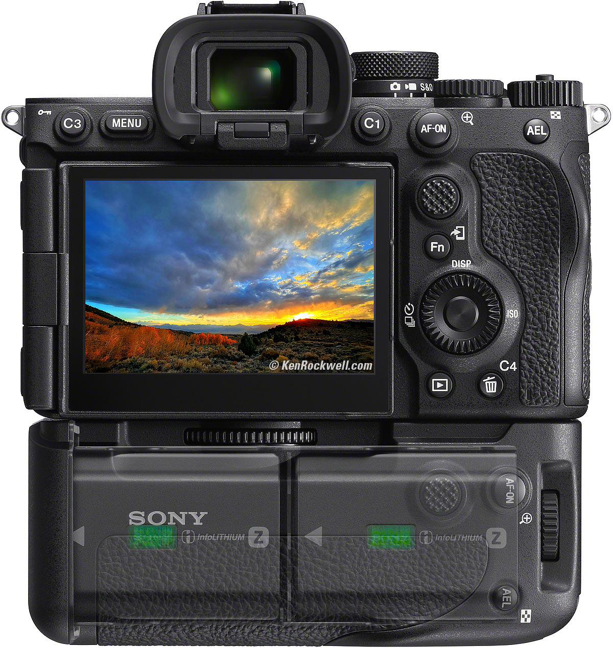 Less battery life than the A7R IV shot either with the finder or the rear LCD. Rated 440 still shots or 90 minutes of video shooting with the viewfinder, down from 530 still shots or 100 minutes of video with the A7R IV. Both use the same battery but the bigger finder draws more power.